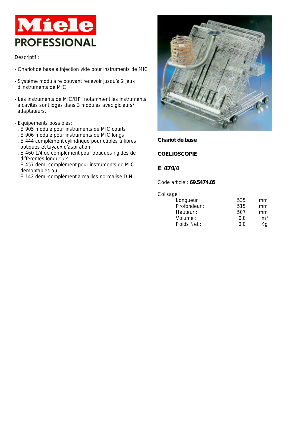 E 474-4 DESCRIPTIF - Chariot médical MIELE - Notice d'utilisation et mode d'emploi gratuit