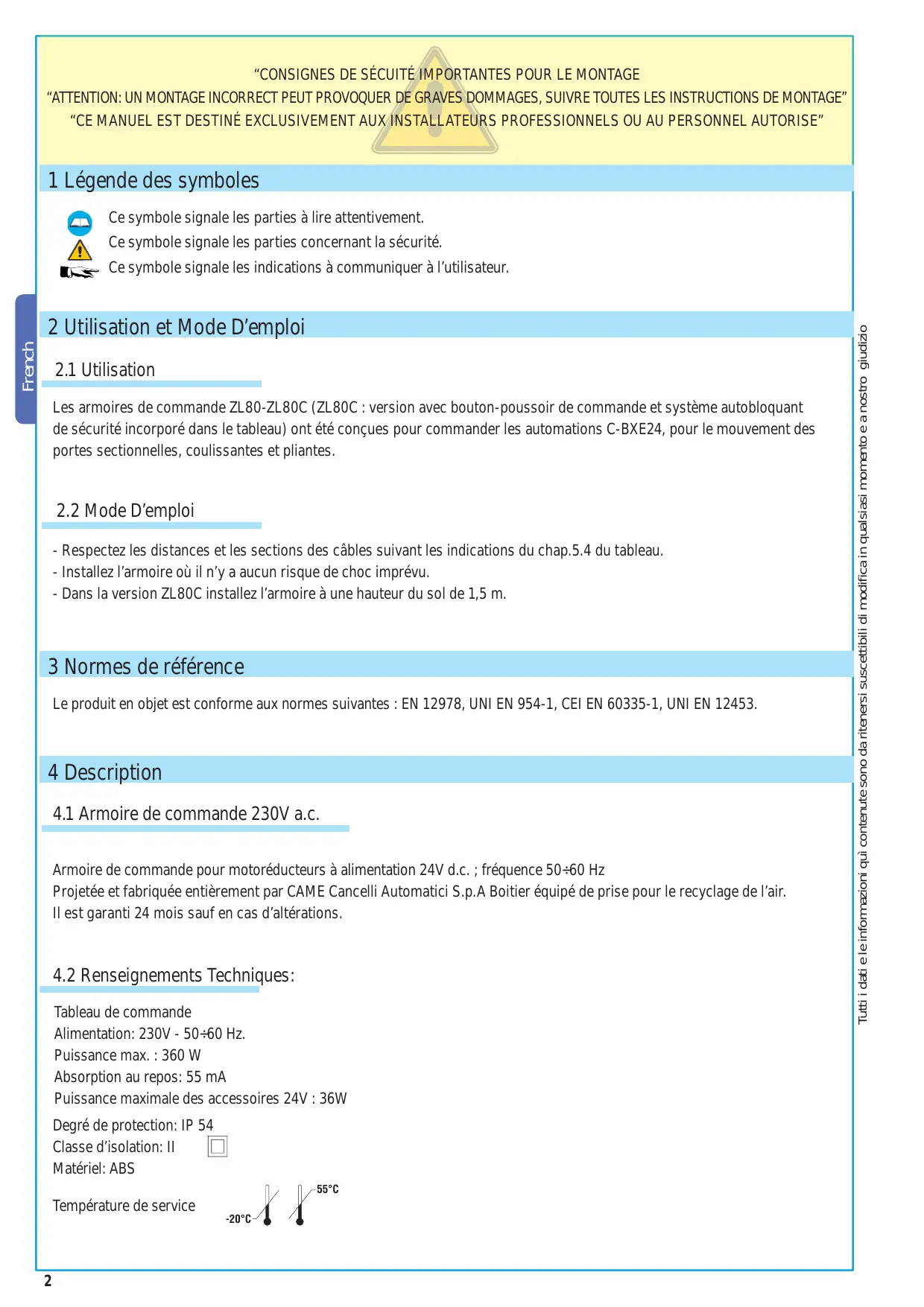 MODE D'EMPLOI ZL80 CAME