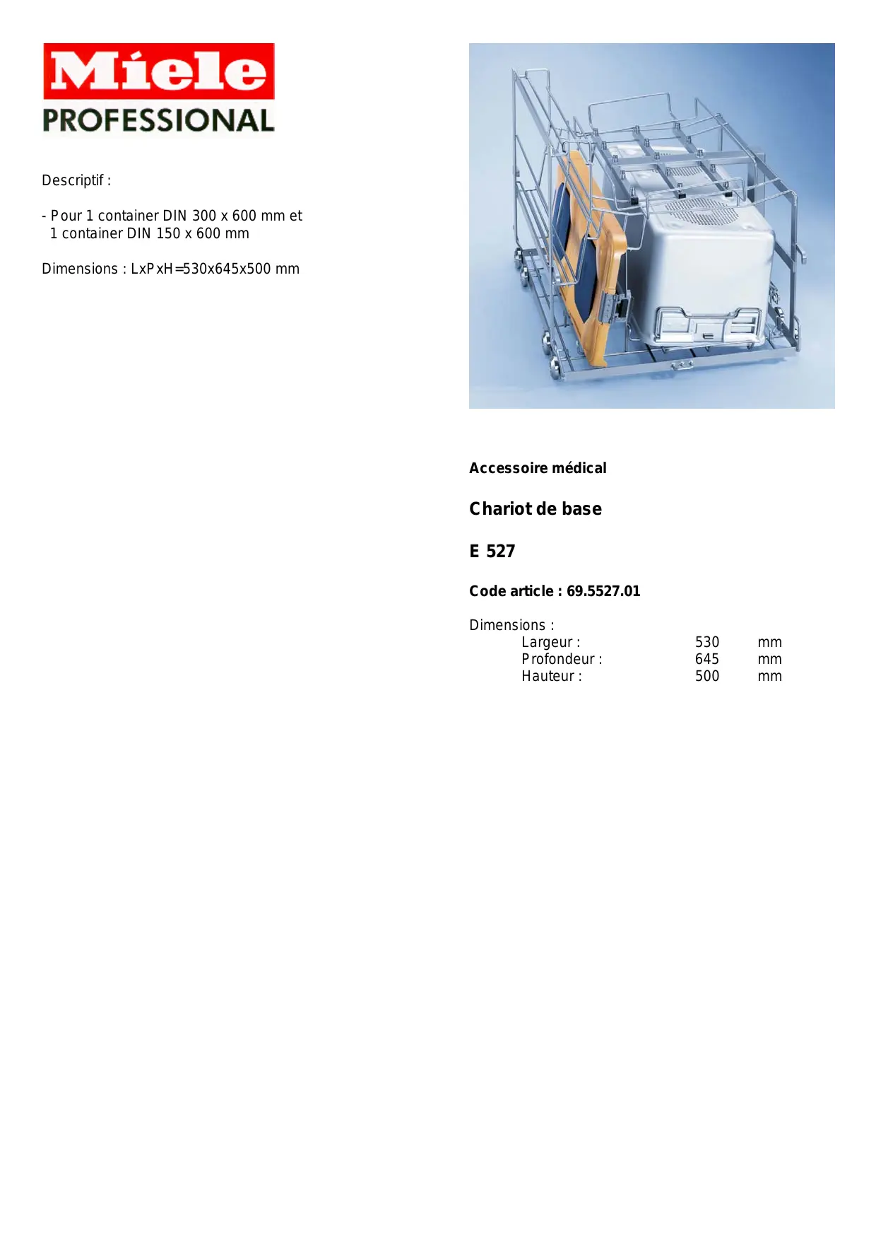 Descriptif : - Pour 1 container DIN 300 x 600 mm et 1 container DIN 150 x 600 mm Dimensions : LxPxH=530x645x500 mm Accessoire médical Chariot de base E 527 Code article : 69.5527.01 Dimensions : Largeur : Profondeur : Hauteur :