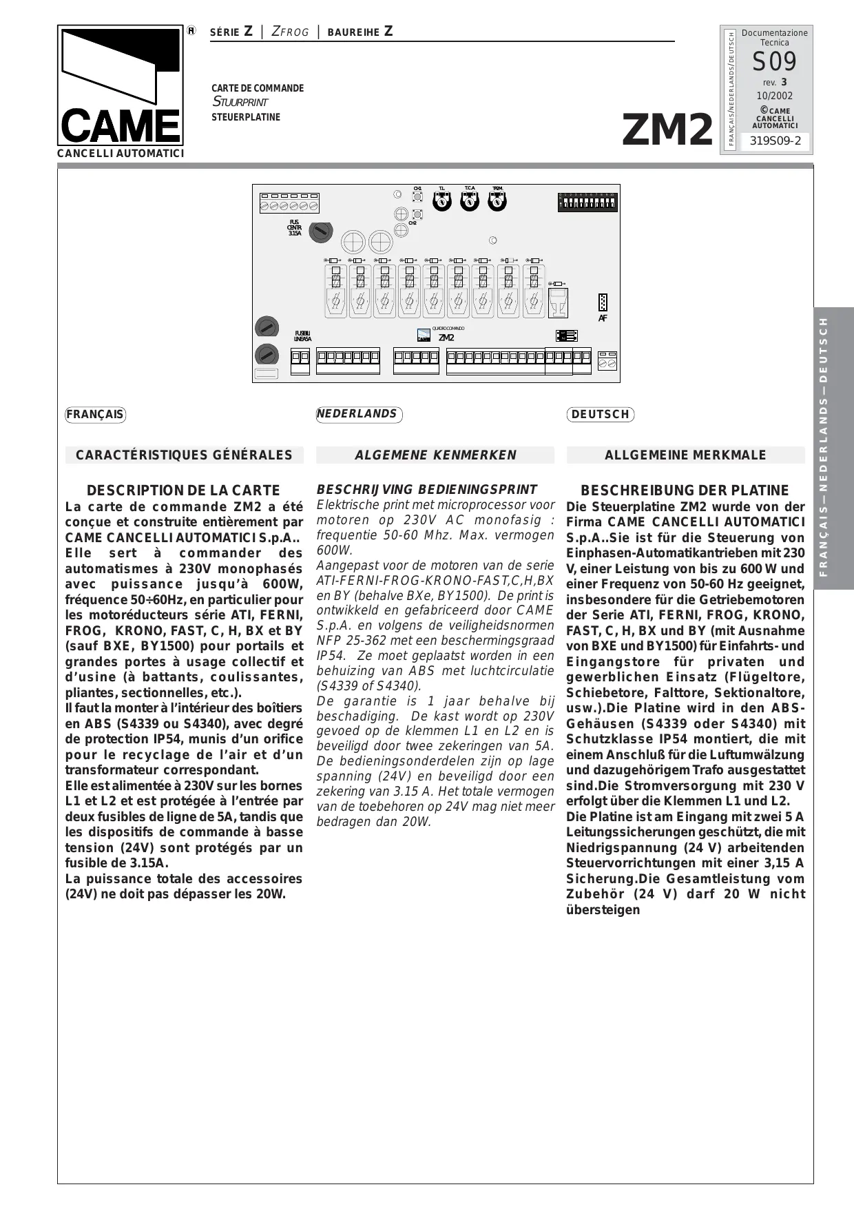 La carte de commande ZM2 a été conçue et construite entièrement par CAME CANCELLI AUTOMATICI S.p.A. Elle sert à commander des automatismes à 230V monophasés avec une puissance jusqu'à 600W, fréquence 50/60 Hz, en particulier pour les motoreducteurs série ATI, FERNI, FROG, KRONO, FAST, C, H, BX et BY (sauf BXE, BY1500) pour portails et grandes portes à usage collectif et d'usine (à battants, coulissantes, pliantes, sectionnelles, etc.).