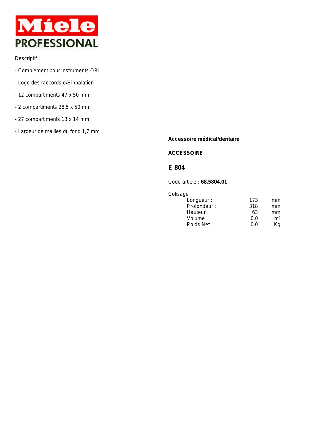 Descriptif : - Complément pour instruments ORL - Loge des raccords dÆinhalation - 12 compartiments 47 x 50 mm - 2 compartiments 28,5 x 50 mm - 27 compartiments 13 x 14 mm - Largeur de mailles du fond 1,7 mm Accessoire médical/dentaire ACCESSOIRE E 804 Code article : 68.5804.01 Colisage : Longueur : Profondeur : Hauteur : Volume : Poids Net :