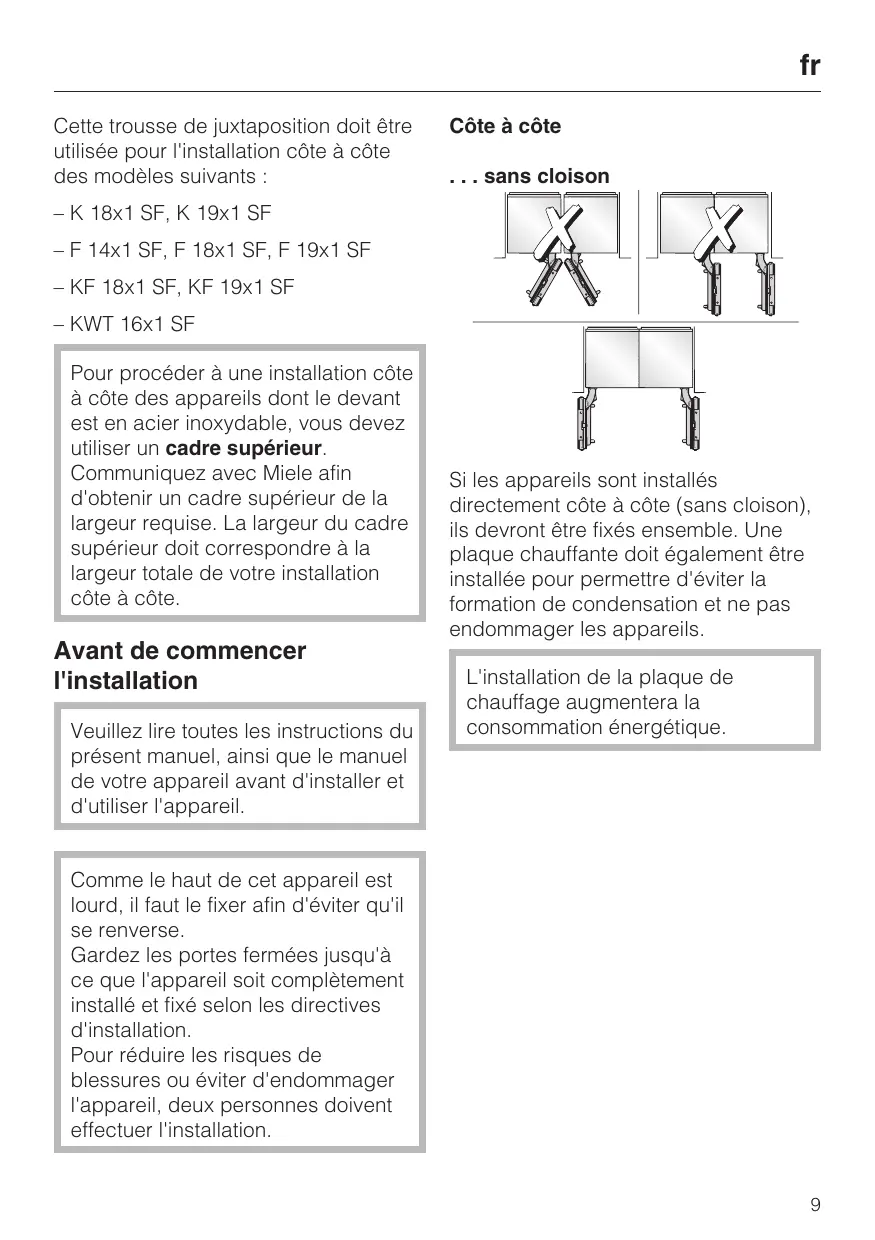 Cette trousse de juxtaposition doit être utilisée pour l'installation côte à côte des modèles suivants : Côte à côte . . . sans cloison – K 18x1 SF, K 19x1 SF – F 14x1 SF, F 18x1 SF, F 19x1 SF – KF 18x1 SF, KF 19x1 SF – KWT 16x1 SF Pour procéder à une installation côte à côte des appareils dont le devant est en acier inoxydable, vous devez utiliser un cadre supérieur. Communiquez avec Miele afin d'obtenir un cadre supérieur de la largeur requise. La largeur du cadre supérieur doit correspondre à la largeur totale de votre installation côte à côte. Avant de commencer l'installation Veuillez lire toutes les instructions du présent manuel, ainsi que le manuel de votre appareil avant d'installer et d'utiliser l'appareil. Si les appareils sont installés directement côte à côte (sans cloison), ils devront être fixés ensemble. Une plaque chauffante doit également être installée pour permettre d'éviter la formation de condensation et ne pas endommager les appareils. L'installation de la plaque de chauffage augmentera la consommation énergétique. Comme le haut de cet appareil est lourd, il faut le fixer afin d'éviter qu'il se renverse. Gardez les portes fermées jusqu'à ce que l'appareil soit complètement installé et fixé selon les directives d'installation. Pour réduire les risques de blessures ou éviter d'endommager l'appareil, deux personnes doivent effectuer l'installation.