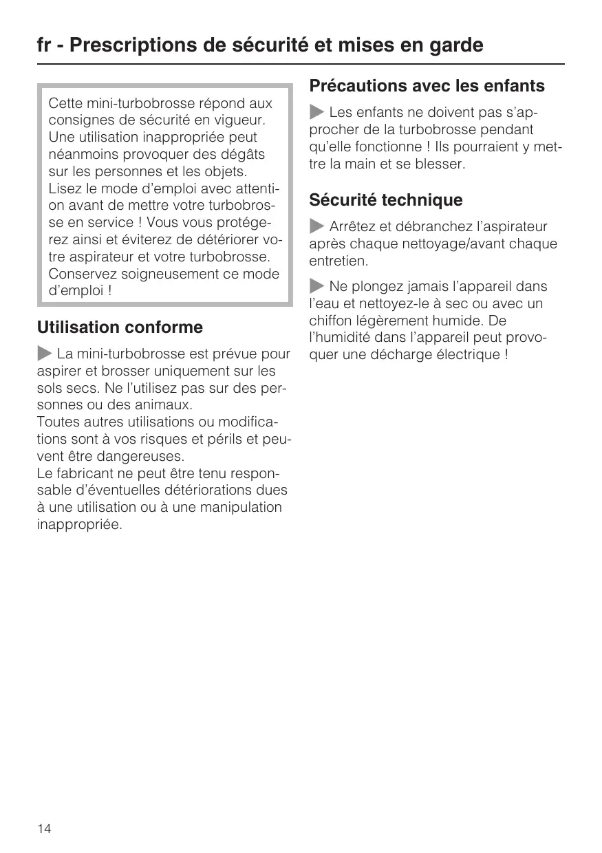 fr - Prescriptions de sécurité et mises en garde Précautions avec les enfants Cette mini-turbobrosse répond aux consignes de sécurité en vigueur. Une utilisation inappropriée peut néanmoins provoquer des dégâts sur les personnes et les objets. Lisez le mode d’emploi avec attention avant de mettre votre turbobrosse en service ! Vous vous protégerez ainsi et éviterez de détériorer votre aspirateur et votre turbobrosse. Conservez soigneusement ce mode d’emploi !
