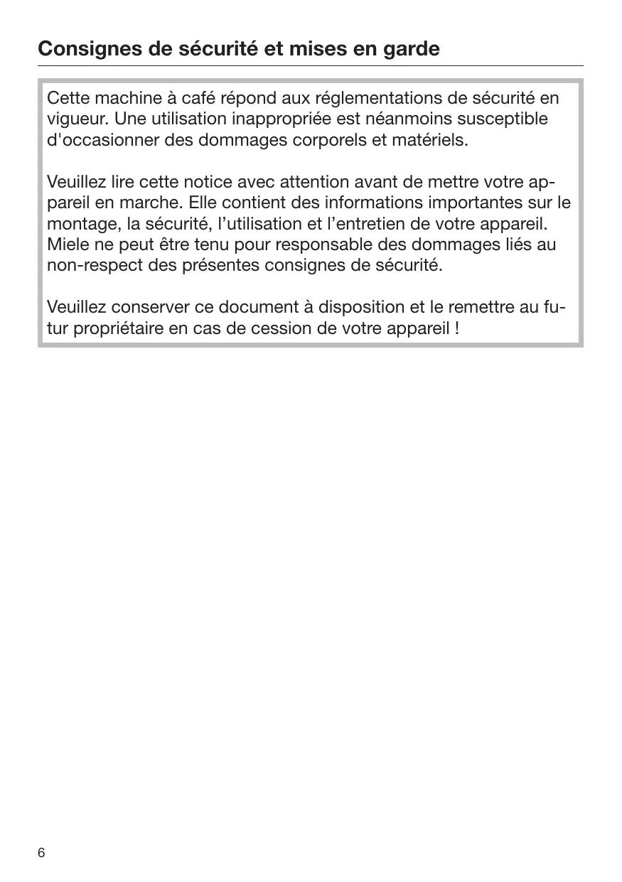 Consignes de sécurité et mises en garde Cette machine à café répond aux réglementations de sécurité en vigueur. Une utilisation inappropriée est néanmoins susceptible d'occasionner des dommages corporels et matériels. Veuillez lire cette notice avec attention avant de mettre votre ap‐ pareil en marche. Elle contient des informations importantes sur le montage, la sécurité, l’utilisation et l’entretien de votre appareil. Miele ne peut être tenu pour responsable des dommages liés au non-respect des présentes consignes de sécurité. Veuillez conserver ce document à disposition et le remettre au fu‐ tur propriétaire en cas de cession de votre appareil !