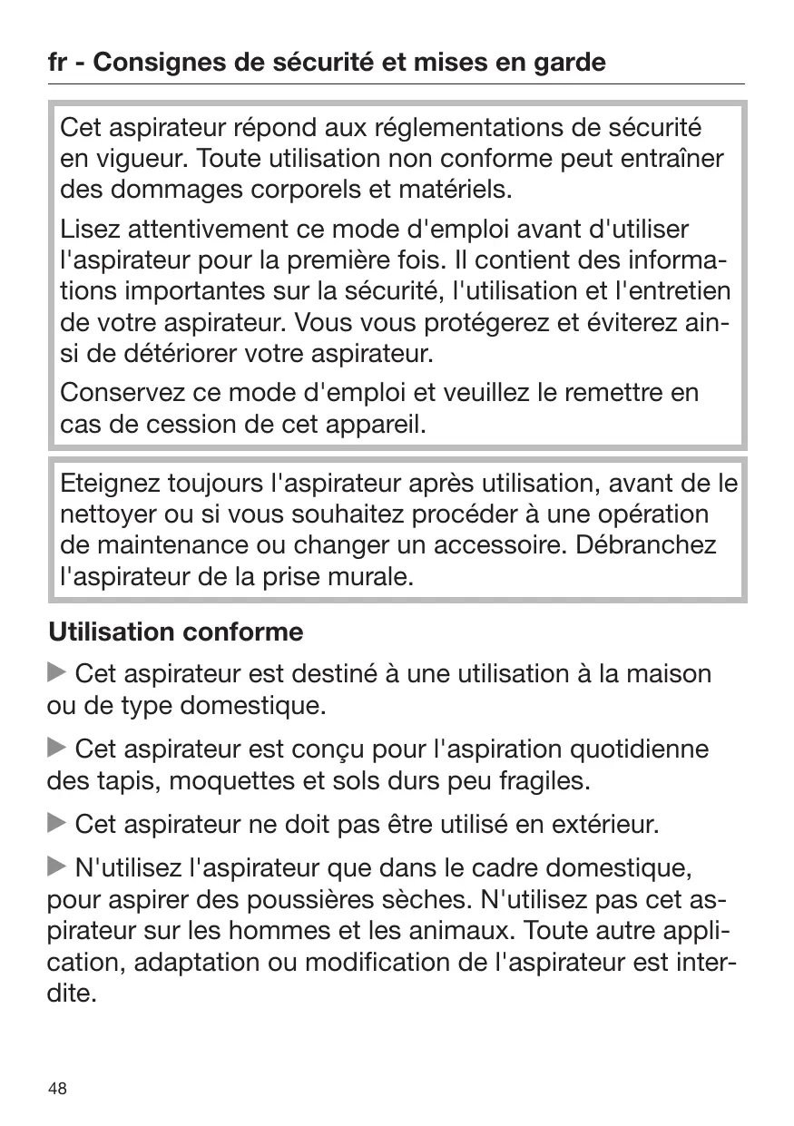 Cet aspirateur est destiné à une utilisation à la maison ou de type domestique. Il est conçu pour l'aspiration quotidienne des tapis, moquettes et sols durs peu fragiles. Cet aspirateur ne doit pas être utilisé en extérieur. N'utilisez l'aspirateur que dans le cadre domestique, pour aspirer des poussières sèches. N'utilisez pas cet aspirateur sur les personnes et les animaux. Toute autre application, adaptation ou modification de l'aspirateur est interdite.