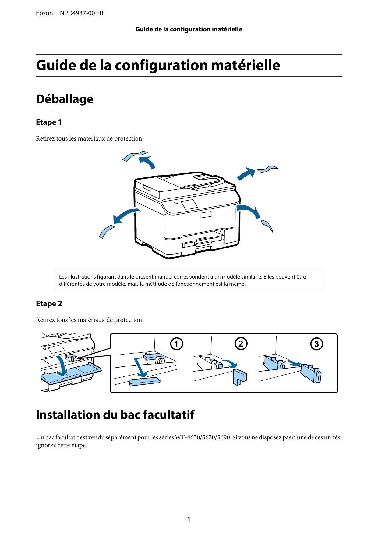 Guide de la configuration matérielle Guide de la configuration matérielle Déballage Etape 1 Retirez tous les matériaux de protection. Les illustrations figurant dans le présent manuel correspondent à un modèle similaire. Elles peuvent être différentes de votre modèle, mais la méthode de fonctionnement est la même. Etape 2 Retirez tous les matériaux de protection. Installation du bac facultatif Un bac facultatif est vendu séparément pour les séries WF-4630/5620/5690. Si vous ne disposez pas d'une de ces unités, ignorez cette étape.