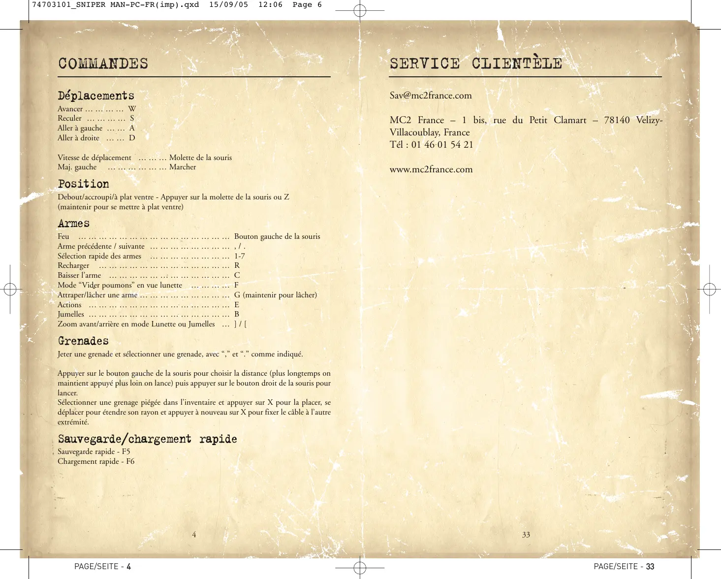 74703101_SNIPER MAN-PC-FR(imp).qxd 15/09/05 12:06 Page 8 GARANTIE Inventaire Garantie limitée à 90 jours MC2 garantit à l’acheteur original du présent produit que le support physique sur lequel le programme du présent produit est enregistré sera exempt de défauts matériels et de fabrication dans des conditions normales d’utilisation pour une période de 90 jours à compter de la date d’achat. L’entière responsabilité de MC2 dans le cadre de la garantie limitée définie ci-dessus sera soumise à sa seule décision de réparer ou de remplacer sans frais le produit, à condition que vous le retourniez dans son emballage d’origine au point de vente, accompagné de l’original ou de la copie du ticket.