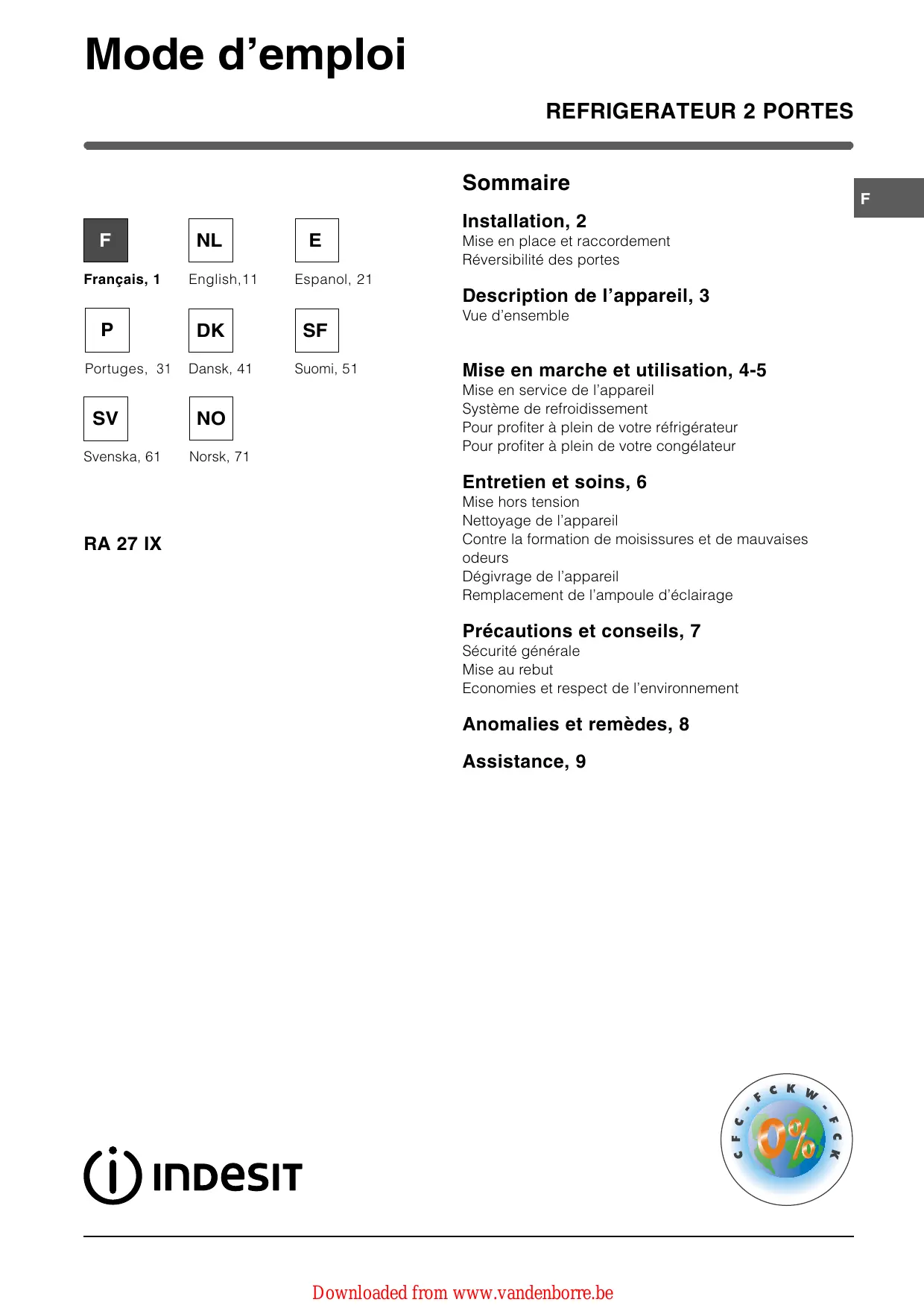 RA 27 IX - Réfrigérateur INDESIT - Notice d'utilisation et mode d'emploi gratuit