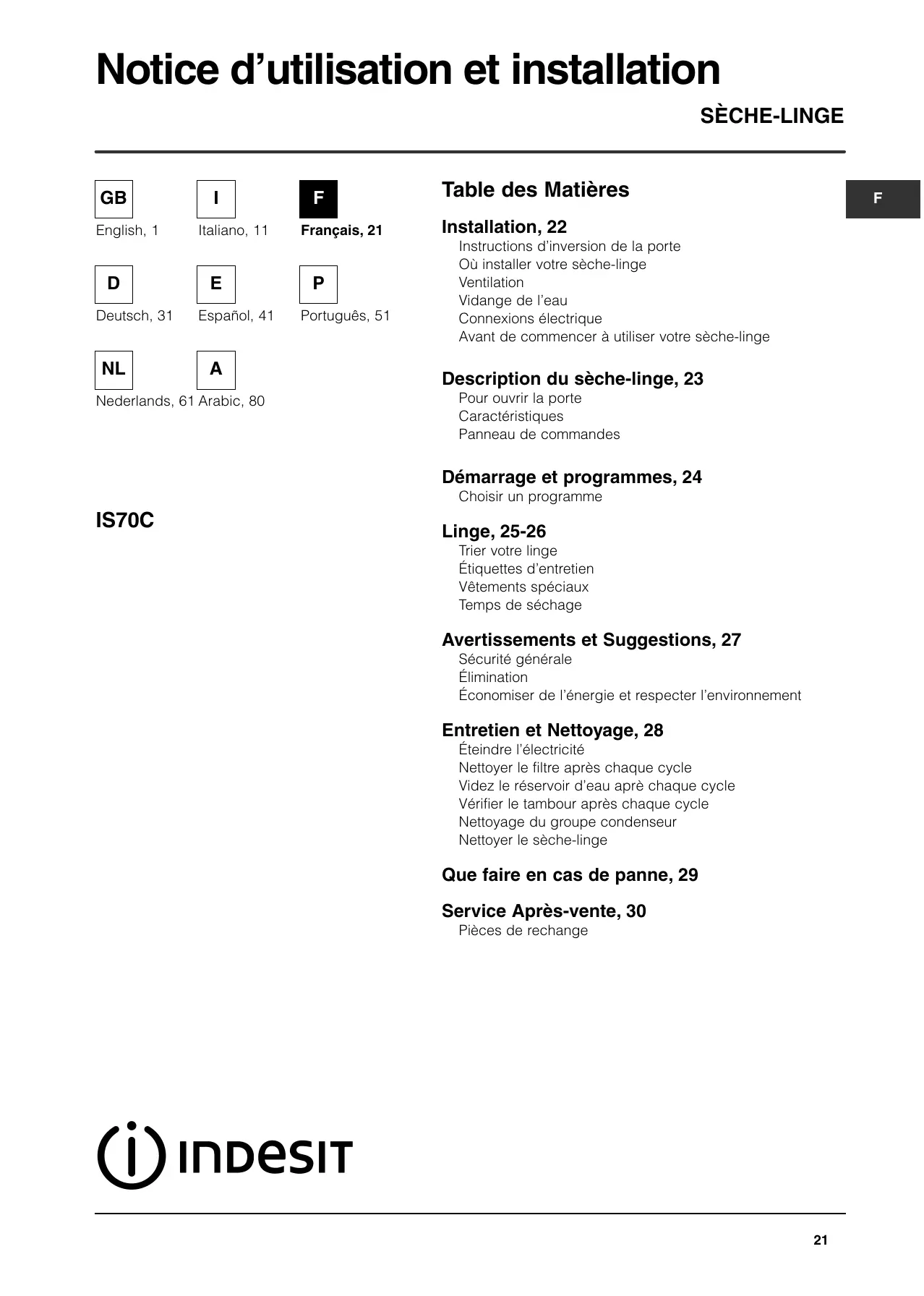 IS70C - Sèche-linge INDESIT - Notice d'utilisation et mode d'emploi gratuit