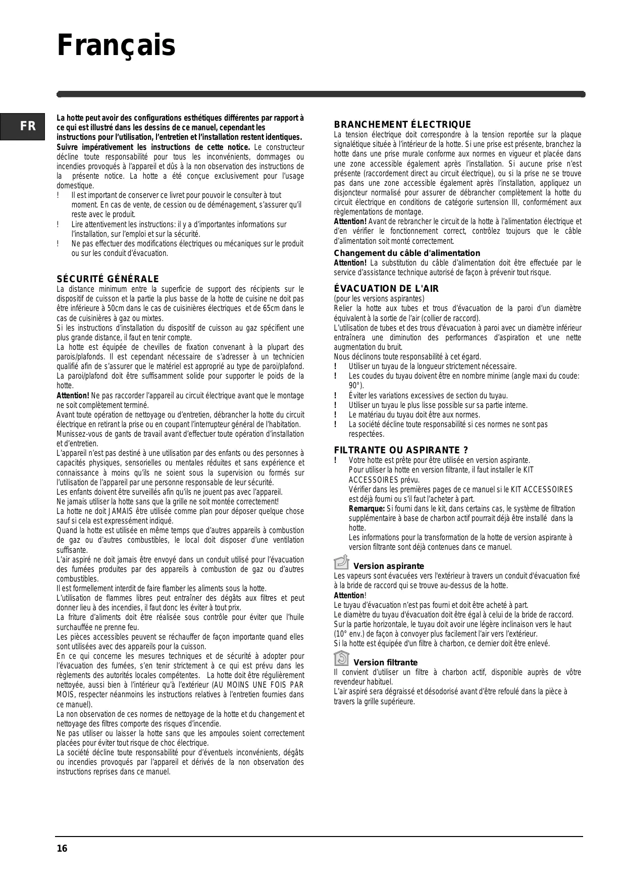 La hotte peut avoir des configurations esthétiques différentes par rapport à ce qui est illustré dans les dessins de ce manuel, cependant les instructions pour l’utilisation, l’entretien et l’installation restent identiques. Suivre impérativement les instructions de cette notice. Le constructeur décline toute responsabilité pour tous les inconvénients, dommages ou incendies provoqués à l’appareil et dûs à la non observation des instructions de la présente notice. La hotte a été conçue exclusivement pour l’usage domestique. Il est important de conserver ce livret pour pouvoir le consulter à tout moment. En cas de vente, de cession ou de déménagement, s’assurer qu’il reste avec le produit. Lire attentivement les instructions: il y a d’importantes informations sur l’installation, sur l’emploi et sur la sécurité. Ne pas effectuer des modifications électriques ou mécaniques sur le produit ou sur les conduit d’évacuation.