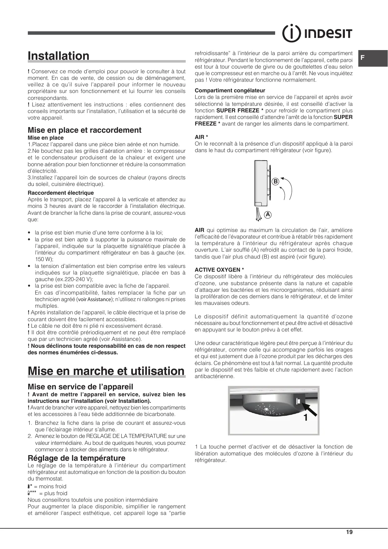 B A AIR qui optimise au maximum la circulation de l’air, améliore l’efficacité de l’évaporateur et contribue à rétablir très rapidement la température à l’intérieur du réfrigérateur après chaque ouverture. L’air soufflé (A) refroidit au contact de la paroi froide, tandis que l’air plus chaud (B) est aspiré (voir figure). ACTIVE OXYGEN * Ce dispositif libère à l’intérieur du réfrigérateur des molécules d’ozone, une substance présente dans la nature et capable d’attaquer les bactéries et les microorganismes, réduisant ainsi la prolifération de ces derniers dans le réfrigérateur, et de limiter les mauvaises odeurs. Le dispositif définit automatiquement la quantité d’ozone nécessaire au bout fonctionnement et peut être activé et désactivé en appuyant sur le bouton prévu à cet effet. Une odeur caractéristique légère peut être perçue à l’intérieur du réfrigérateur, comme celle qui accompagne parfois les orages et qui est justement due à l’ozone produit par les décharges des éclairs. Ce phénomène est tout à fait normal. La quantité produite par le dispositif est très faible et chute rapidement avec l’action antibactérienne.