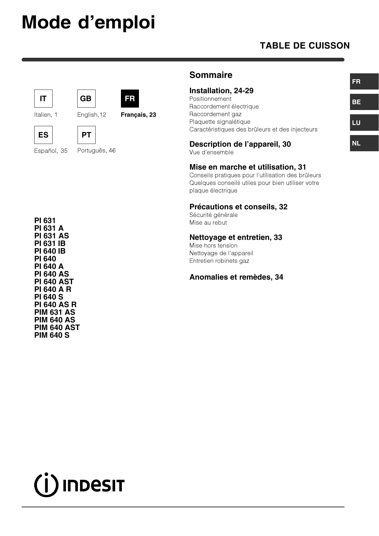 PIM631AS - Plaque de cuisson INDESIT - Notice d'utilisation et mode d'emploi gratuit