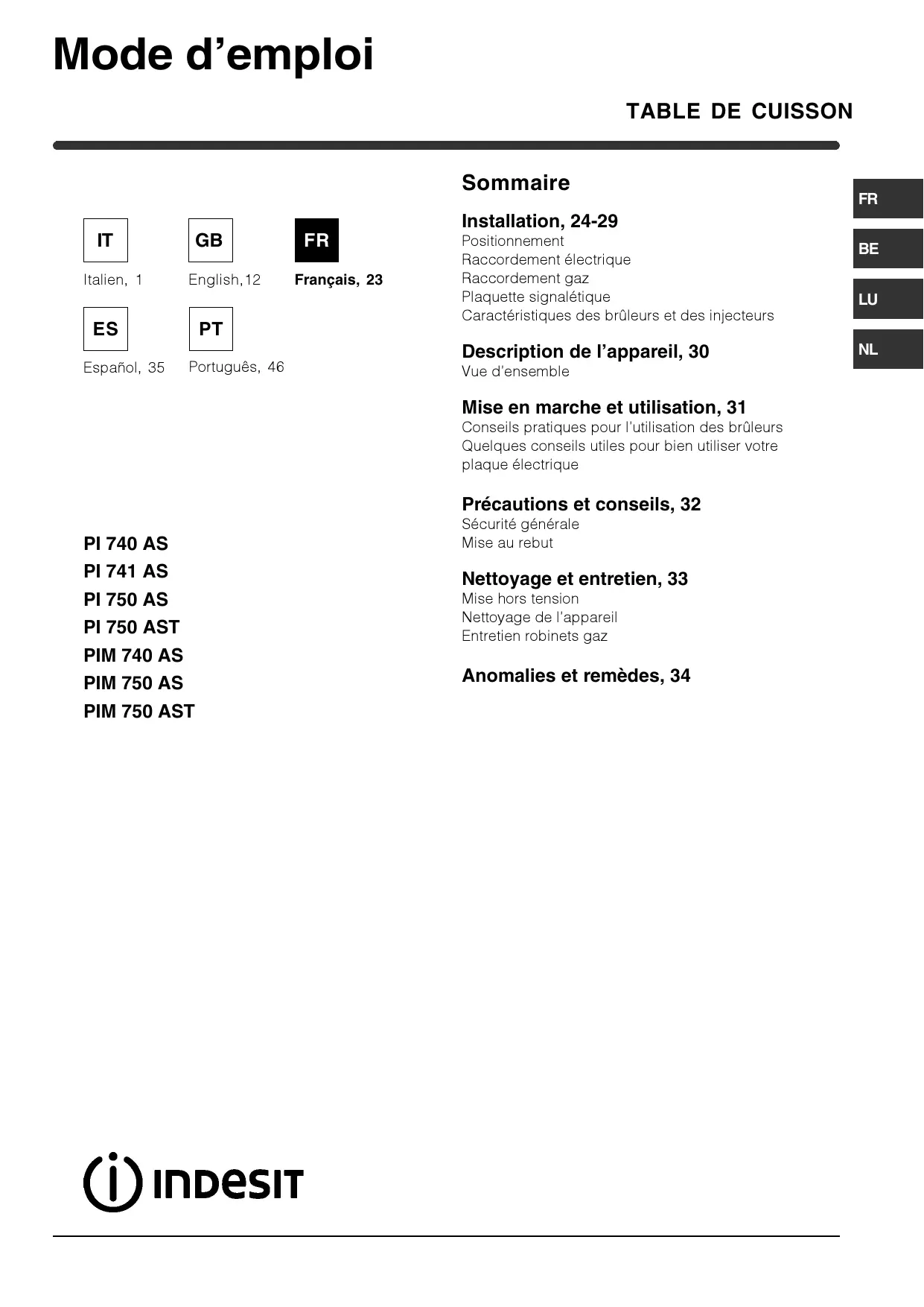 PIM740AS - Plaque de cuisson INDESIT - Notice d'utilisation et mode d'emploi gratuit