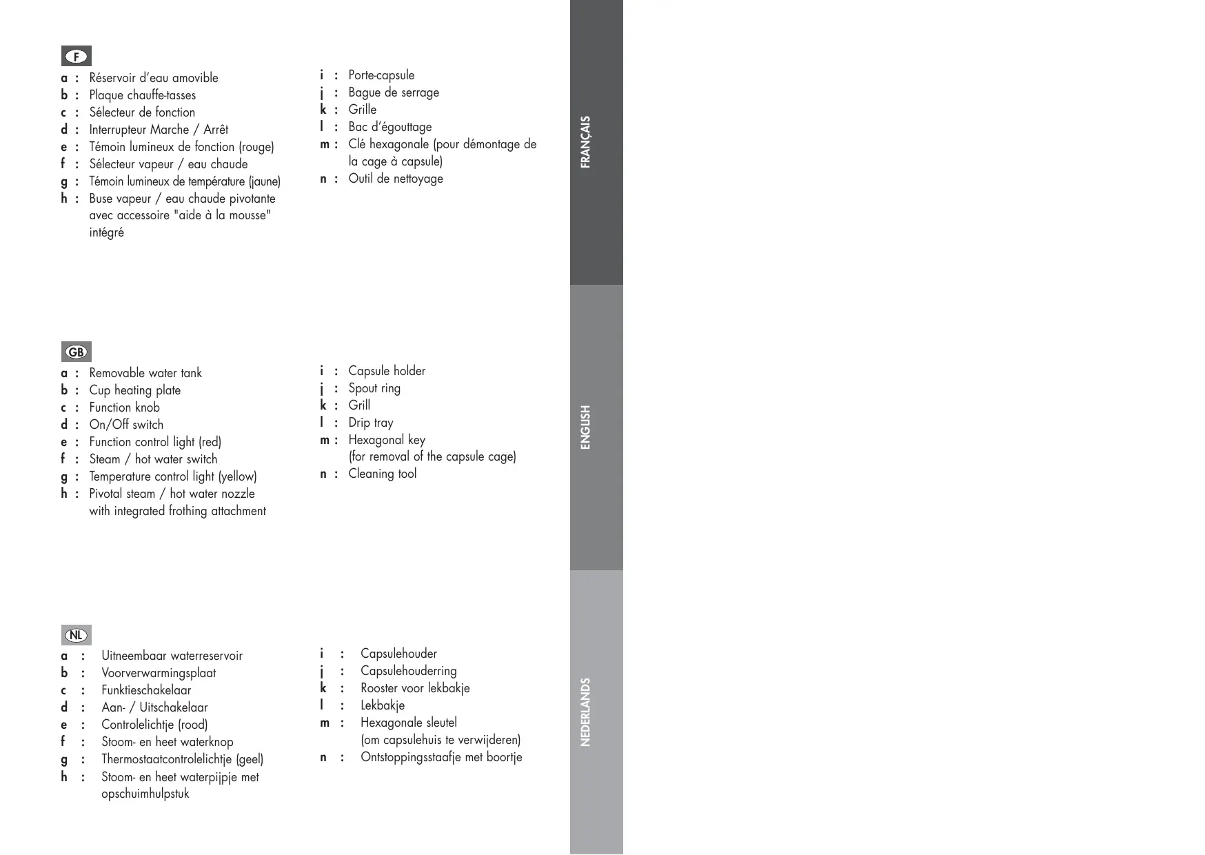 i : Porte-capsule j : Bague de serrage k : Grille l : Bac d'égoutage m : Clé hexagonale (pour démontage de la cage à capsule) n : Outil de nettoyage