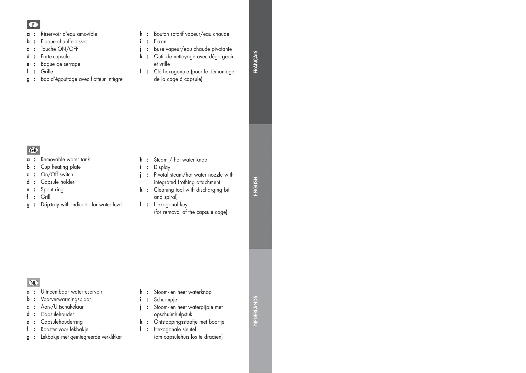 Bouton rotatif vapeur/eau chaude Ecran Buse vapeur/eau chaude pivotante Outil de nettoyage avec dégorgeoir et vrille : Clé hexagonale (pour le démontage de la cage à capsule) FRANÇAIS