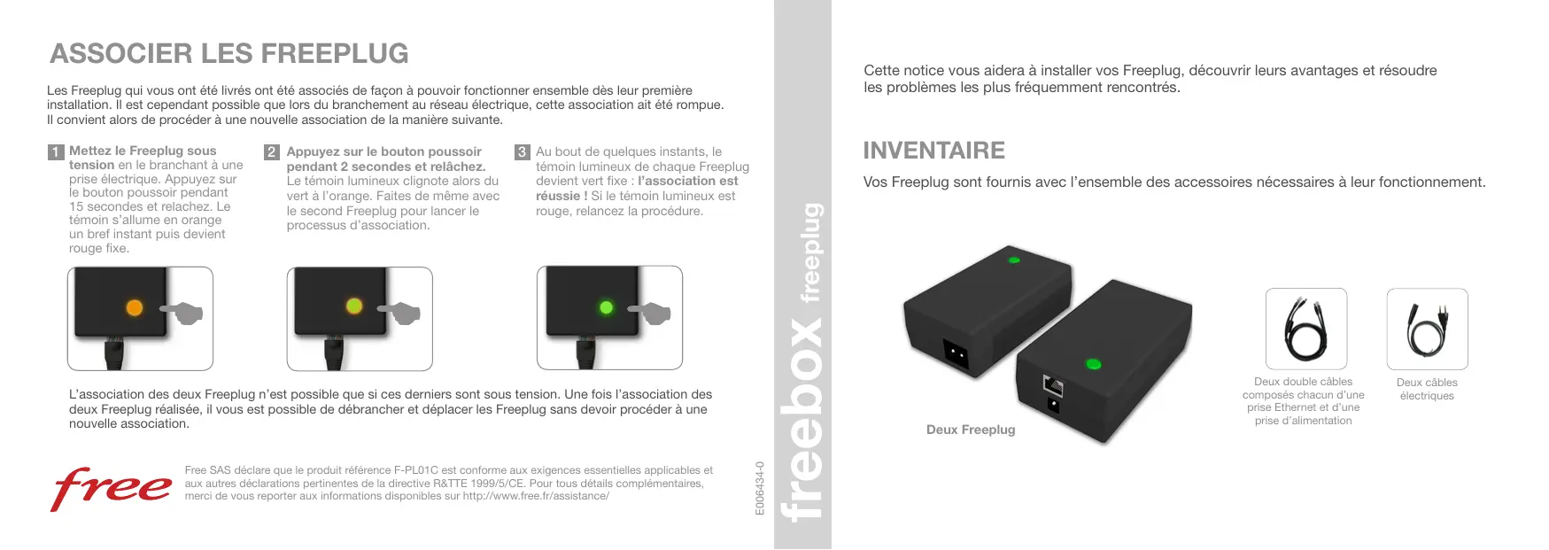 Cette notice vous aidera à installer vos Freeplug, découvrir leurs avantages et résoudre les problèmes les plus fréquemment rencontrés. Les Freeplug qui vous ont été livrés ont été associés de façon à pouvoir fonctionner ensemble dès leur première installation. Il est cependant possible que lors du branchement au réseau électrique, cette association ait été rompue. Il convient alors de procéder à une nouvelle association de la manière suivante. tension en le branchant à une prise électrique. Appuyez sur le bouton poussoir pendant 15 secondes et relachez. Le témoin s’allume en orange un bref instant puis devient rouge fixe. 2 Appuyez sur le bouton poussoir pendant 2 secondes et relâchez. Le témoin lumineux clignote alors du vert à l’orange. Faites de même avec le second Freeplug pour lancer le processus d’association. INVENTAIRE 3 Au bout de quelques instants, le témoin lumineux de chaque Freeplug devient vert fixe : l’association est réussie ! Si le témoin lumineux est rouge, relancez la procédure. Vos Freeplug sont fournis avec l’ensemble des accessoires nécessaires à leur fonctionnement. freeplug 1 Mettez le Freeplug sous L’association des deux Freeplug n’est possible que si ces derniers sont sous tension. Une fois l’association des deux Freeplug réalisée, il vous est possible de débrancher et déplacer les Freeplug sans devoir procéder à une nouvelle association. E006434-0 Free SAS déclare que le produit référence F-PL01C est conforme aux exigences essentielles applicables et aux autres déclarations pertinentes de la directive R&TTE 1999/5/CE. Pour tous détails complémentaires, merci de vous reporter aux informations disponibles sur http://www.free.fr/assistance/ Deux Freeplug Deux double câbles composés chacun d’une prise Ethernet et d’une prise d’alimentation Deux câbles électriques INVENTAIRE