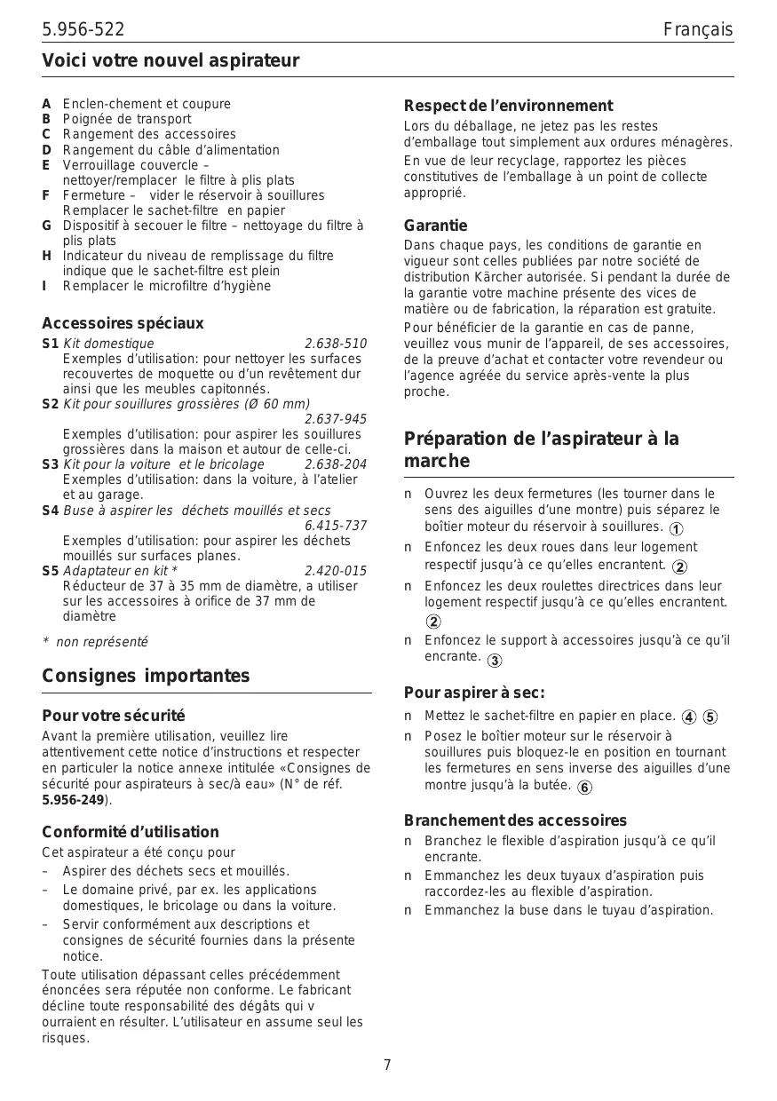 S1 Kit domestique S3 Kit pour la voiture et le bricolage 2.638-204 Exemples d’utilisation: dans la voiture, à l’atelier et au garage. S4 Buse à aspirer les déchets mouillés et secs 6.415-737 Exemples d’utilisation: pour aspirer les déchets mouillés sur surfaces planes. S5 Adaptateur en kit * 2.420-015 Réducteur de 37 à 35 mm de diamètre, a utiliser sur les accessoires à orifice de 37 mm de diamètre