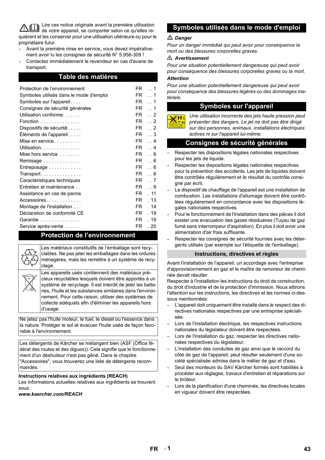 EN - 20 Lire ces notice originale avant la première utilisation de votre appareil, se comporter selon ce qu'elles requièrent et les conserver pour une utilisation ultérieure ou pour le propriétaire futur. – Avant la première mise en service, vous devez impérativement avoir lu les consignes de sécurité N° 5.956-309 ! – Contactez immédiatement le revendeur en cas d'avarie de transport. Table des matières Protection de l’environnement Symboles utilisés dans le mode d'emploi Symboles sur l'appareil ... Consignes de sécurité générales Utilisation conforme... Fonction ... Dispositifs de sécurité ... Éléments de l'appareil... Mise en service ... Utilisation... Mise hors service ... Remisage ... Entreposage ... Transport... Caractéristiques techniques Entretien et maintenance ... Assistance en cas de panne Accessoires... Montage de l'installation ... Déclaration de conformité CE Garantie ... Service après-vente ...
