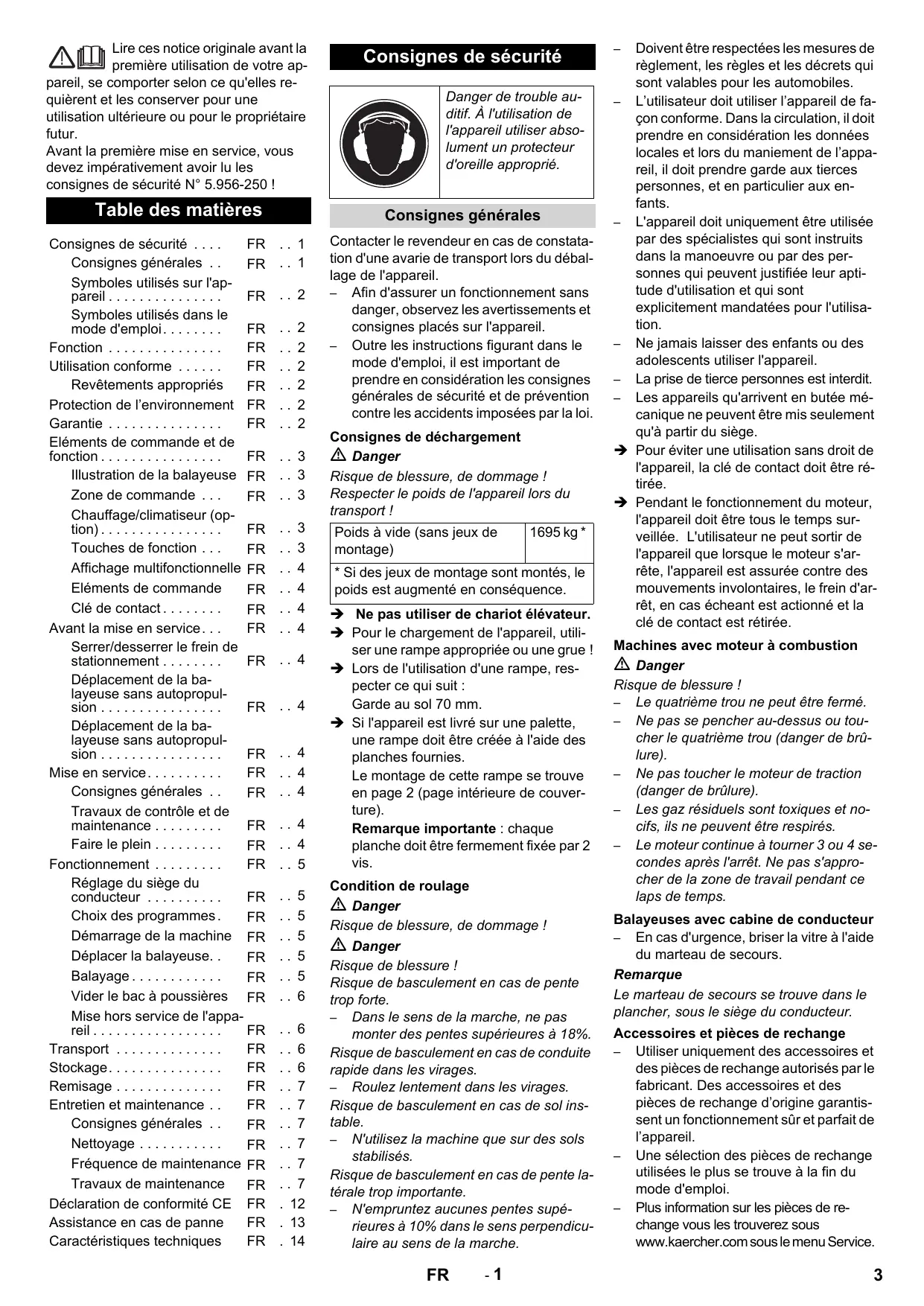 Lire ces notice originale avant la première utilisation de votre appareil, se comporter selon ce qu'elles requièrent et les conserver pour une utilisation ultérieure ou pour le propriétaire futur. Avant la première mise en service, vous devez impérativement avoir lu les consignes de sécurité N° 5.956-250 ! Table des matières Consignes de sécurité ... Consignes générales ... Symboles utilisés sur l'appareil ... Symboles utilisés dans le mode d'emploi... Fonction ... Utilisation conforme ... Revêtements appropriés Protection de l’environnement FR Garantie ... Eléments de commande et de fonction ... Illustration de la balayeuse FR Zone de commande ... Chauffage/climatiseur (option) ... Touches de fonction ... Affichage multifonctionnelle FR Eléments de commande Clé de contact ... Avant la mise en service... Serrer/desserrer le frein de stationnement ... Déplacement de la balayeuse sans autopropulsion ... Déplacement de la balayeuse sans autopropulsion ... Mise en service... Consignes générales ... Travaux de contrôle et de maintenance ... Faire le plein ... Fonctionnement ... Réglage du siège du conducteur ... Choix des programmes . Démarrage de la machine FR Déplacer la balayeuse... Balayage ... Vider le bac à poussières FR Mise hors service de l'appareil ... Transport ... Stockage... Remisage ... Entretien et maintenance ... Consignes générales ... Nettoyage ... Fréquence de maintenance FR Travaux de maintenance Déclaration de conformité CE FR Assistance en cas de panne Caractéristiques techniques