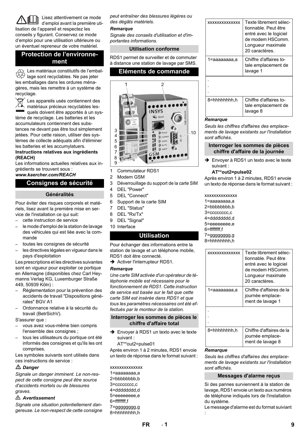 Si des pannes surviennent à la station de lavage, RDS1 envoie un texto aux numéros de téléphone indiqués lors de l'installation du système. Le message d'alarme est du format suiviant : -1