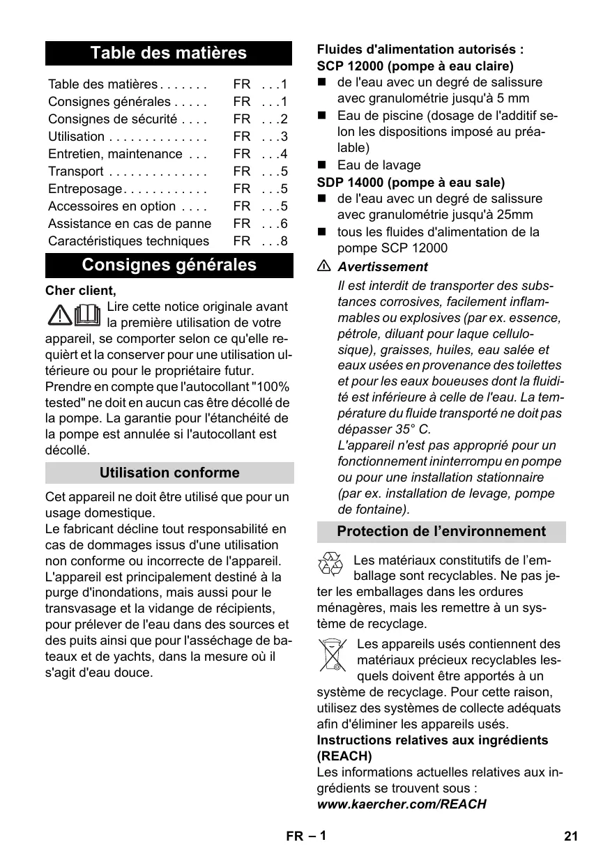 Consignes générales Cher client, Lire cette notice originale avant la première utilisation de votre appareil, se comporter selon ce qu'elle requièrt et la conserver pour une utilisation ultérieure ou pour le propriétaire futur. Prendre en compte que l'autocollant "100% tested" ne doit en aucun cas être décollé de la pompe. La garantie pour l'étanchéité de la pompe est annulée si l'autocollant est décollé. Utilisation conforme Cet appareil ne doit être utilisé que pour un usage domestique. Le fabricant décline tout responsabilité en cas de dommages issus d'une utilisation non conforme ou incorrecte de l'appareil. L'appareil est principalement destiné à la purge d'inondations, mais aussi pour le transvasage et la vidange de récipients, pour prélever de l'eau dans des sources et des puits ainsi que pour l'asséchage de bateaux et de yachts, dans la mesure où il s'agit d'eau douce. Fluides d'alimentation autorisés : SCP 12000 (pompe à eau claire) de l'eau avec un degré de salissure avec granulométrie jusqu'à 5 mm Eau de piscine (dosage de l'additif selon les dispositions imposé au préalable) Eau de lavage SDP 14000 (pompe à eau sale) de l'eau avec un degré de salissure avec granulométrie jusqu'à 25mm tous les fluides d'alimentation de la pompe SCP 12000 몇 Avertissement Il est interdit de transporter des substances corrosives, facilement inflammables ou explosives (par ex. essence, pétrole, diluant pour laque cellulosique), graisses, huiles, eau salée et eaux usées en provenance des toilettes et pour les eaux boueuses dont la fluidité est inférieure à celle de l'eau. La température du fluide transporté ne doit pas dépasser 35° C. L'appareil n'est pas approprié pour un fonctionnement ininterrompu en pompe ou pour une installation stationnaire (par ex. installation de levage, pompe de fontaine). Protection de l’environnement Les matériaux constitutifs de l’emballage sont recyclables. Ne pas jeter les emballages dans les ordures ménagères, mais les remettre à un système de recyclage. Les appareils usés contiennent des matériaux précieux recyclables lesquels doivent être apportés à un système de recyclage. Pour cette raison, utilisez des systèmes de collecte adéquats afin d'éliminer les appareils usés. Instructions relatives aux ingrédients (REACH) Les informations actuelles relatives aux ingrédients se trouvent sous : www.kaercher.com/REACH FR – 1