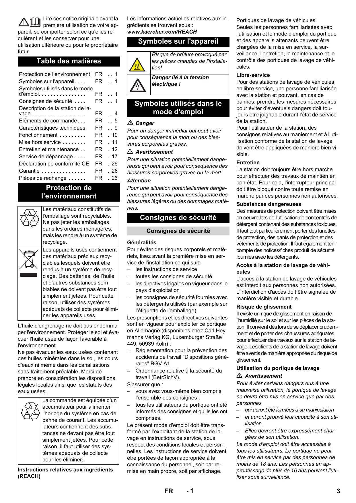 Protection de l’environnement Les matériaux constitutifs de l'emballage sont recyclables. Ne pas jeter les emballages dans les ordures ménagères, mais les rendre à un système de recyclage. Les appareils usés contiennent des matériaux précieux recyclables lesquels doivent être rendus à un système de recyclage. Des batteries, de l’huile et d'autres substances semblables ne doivent pas être tout simplement jetées. Pour cette raison, utiliser des systèmes adéquats de collecte pour éliminer les appareils usés. L'huile d'engrenage ne doit pas endommager l'environnement. Protéger le sol et évacuer l'huile usée de façon favorable à l'environnement. Ne pas évacuer les eaux usées contenant des huiles minérales dans le sol, les cours d'eaux ni même dans les canalisations sans traitement préalable. Merci de prendre en considération les dispositions légales locales ainsi que les statuts des eaux usées. La commande est équipée d'un accumulateur pour alimenter l'horloge du système en cas de panne de courant. Les accumulateurs contiennent des substances ne devant pas être tout simplement jetées. Pour cette raison, il faut utiliser des systèmes adéquats de collecte pour les éliminer. Instructions relatives aux ingrédients (REACH) Les informations actuelles relatives aux ingrédients se trouvent sous : www.kaercher.com/REACH Symboles sur l'appareil Risque de brûlure provoqué par les pièces chaudes de l'installation! Danger lié à la tension électrique ! Symboles utilisés dans le mode d'emploi Danger Pour un danger immédiat qui peut avoir pour conséquence la mort ou des blessures corporelles graves. 몇 Avertissement Pour une situation potentiellement dangereuse qui peut avoir pour conséquence des blessures corporelles graves ou la mort. Attention Pour une situation potentiellement dangereuse qui peut avoir pour conséquence des blessures légères ou des dommages matériels. Consignes de sécurité Consignes de sécurité Généralités Pour éviter des risques corporels et matériels, lisez avant la première mise en service de l'installation ce qui suit: – les instructions de service – toutes les consignes de sécurité – les directives légales en vigueur dans le pays d'exploitation – les consignes de sécurité fournies avec les détergents utilisés (par exemple sur l'étiquette de l'emballage). Les prescriptions et les directives suivantes sont en vigueur pour exploiter ce portique en Allemagne (disponibles chez Carl Heymanns Verlag KG, Luxemburger Straße 449, 50939 Köln) : – Réglementation pour la prévention des accidents de travail "Dispositions générales" BGV A1 – Ordonnance relative à la sécurité du travail (BetrSichV). S'assurer que : – vous avez vous-même bien compris l'ensemble des consignes ; – tous les utilisateurs du portique ont été informés des consignes et qu'ils les ont comprises. Le présent mode d'emploi doit être transformé par l'exploitant de la station de lavage en instructions de service, sous respect des conditions locales et personnelles. Les instructions de service doivent être portées de façon appropriée à la connaissance du personnel, soit par remise en main propre, soit par affichage.