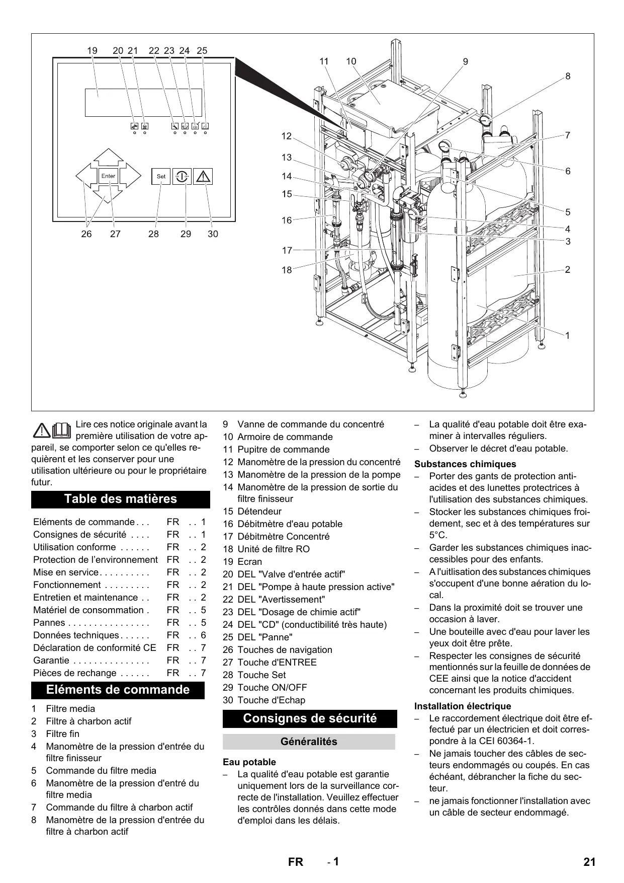 Armoire de commande Pupitre de commande Manomètre de la pression du concentré Manomètre de la pression de la pompe Manomètre de la pression de sortie du filtre finisseur Détendeur Débitmètre d'eau potable Débitmètre Concentré Unité de filtre RO Ecran DEL "Valve d'entrée actif" DEL "Pompe à haute pression active" DEL "Avertissement" DEL "Dosage de chimie actif" DEL "CD" (conductibilité très haute) DEL "Panne" Touches de navigation Touche d'ENTREE Touche Set Touche ON/OFF Touche d'Echap