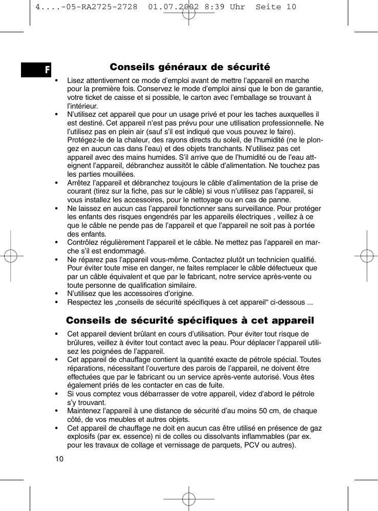 Cet appareil de chauffage contient la quantité exacte de pétrole spécial. Toutes réparations, nécessitant l’ouverture des parois de l’appareil, ne doivent être effectuées que par le fabricant ou un service après-vente autorisé. Vous êtes également priés de les contacter en cas de fuite. Si vous comptez vous débarrasser de votre appareil, videz d’abord le pétrole s’y trouvant. Maintenez l’appareil à une distance de sécurité d’au moins 50 cm, de chaque côté, de vos meubles et autres objets. Cet appareil de chauffage ne doit en aucun cas être utilisé en présence de gaz explosifs (par ex. essence) ni de colles ou dissolvants inflammables (par ex. pour les travaux de collage et vernissage de parquets, PCV ou autres).