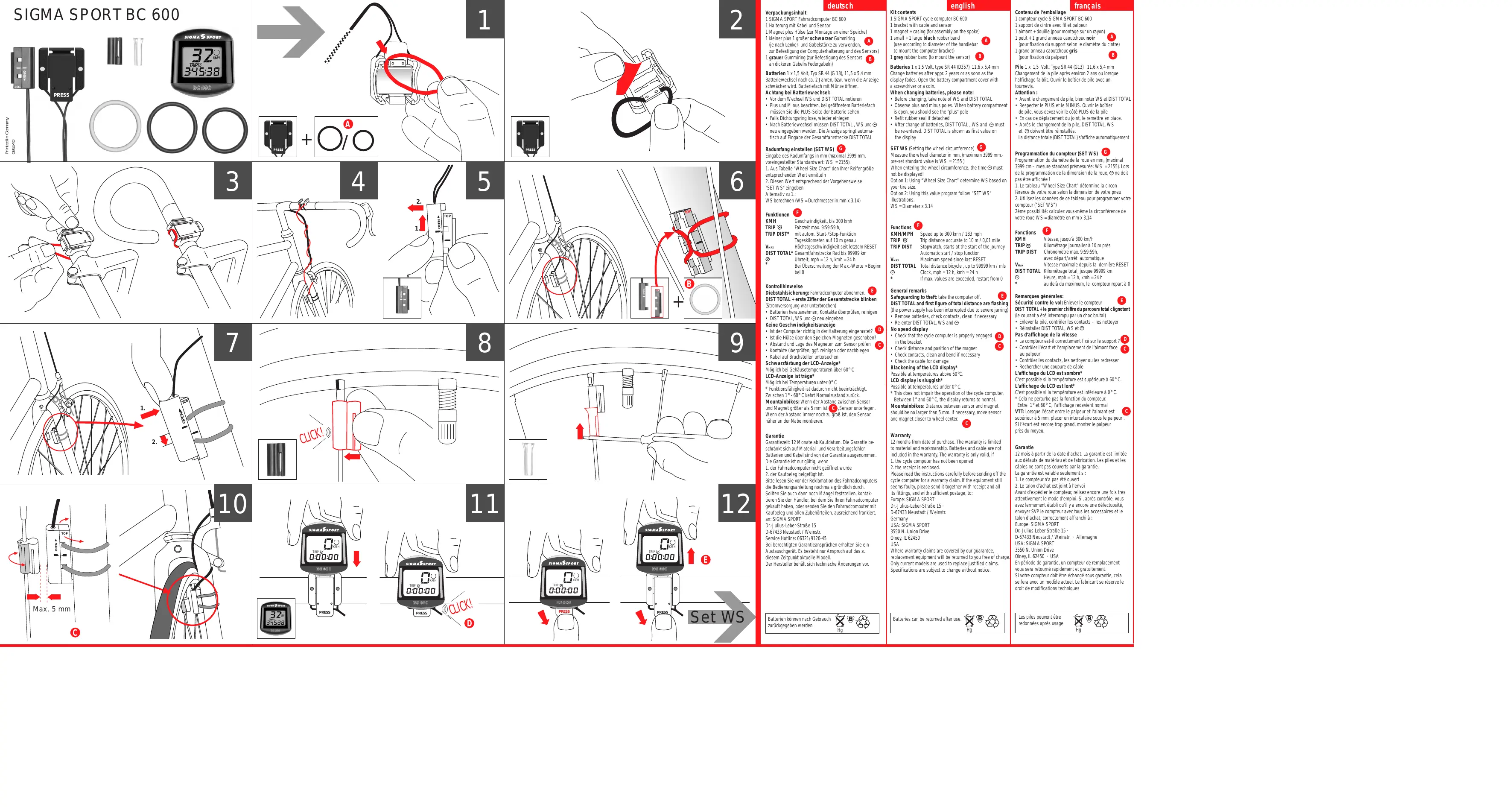 PRESS PRESS Set WS Batterien können nach Gebrauch zurückgegeben werden. Programmation du compteur (SET WS) G Programmation du diamètre de la roue en mm, (maximal 3999 cm – mesure standard prémesurée: WS = 2155). Lors de la programmation de la dimension de la roue, ne doit pas être affichée !
