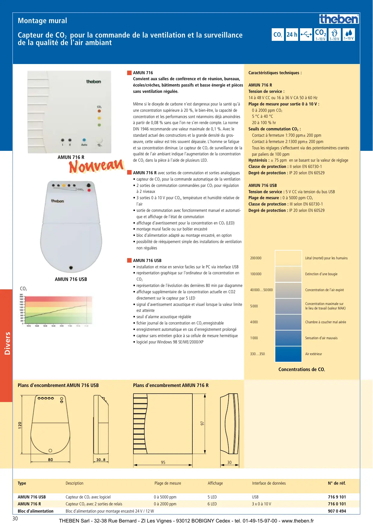 À 95 30 Type Description Plage de mesure Affichage Interface de données N° de réf. AMUN 716 USB Capteur de CO: avec logiciel 0 à 5000 ppm S LED USB 7169101 AMUN 716R Capteur CO, avec 2 sorties de relais 0 à 2000 ppm 6LED 3x0à10V 7160101 Bloc d'alimentation Bloc d'alimentation pour montage encastré 24 V / 12W 907 0 494 30 THEBEN Sarl - 32-38 Rue Bernard - ZI Les Vignes - 93012 BOBIGNY Cedex - tel. 01-49-15-97-00 - www.theben.fr