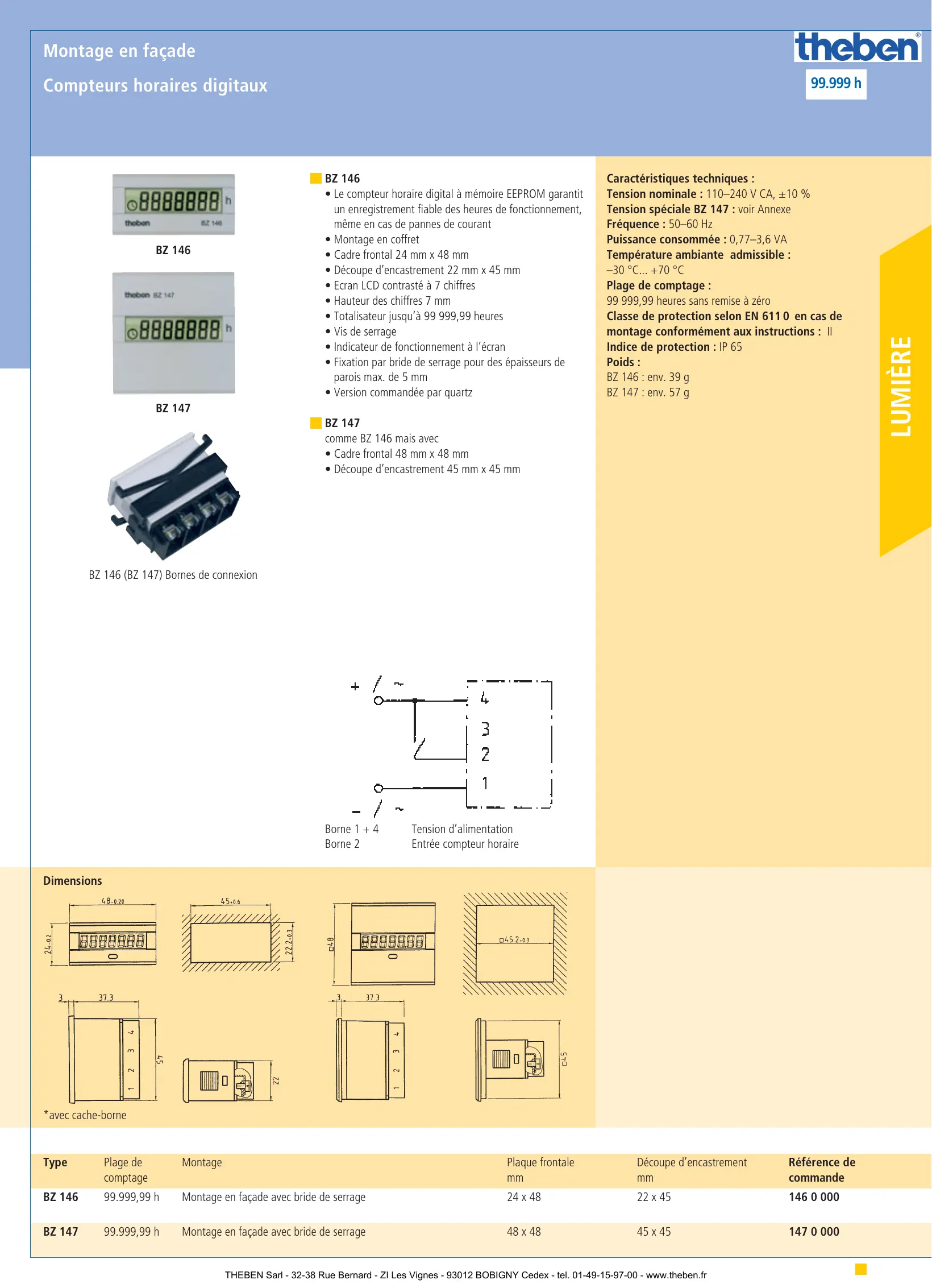 - Découpe d’encastrement 45 mm x 45 mm BZ 146 (BZ 147) Bornes de connexion Borne 1 + 4 Borne 2 Tension d’alimentation Entrée compteur horaire Dimensions *avec cache-borne Type Plage de comptage Montage Plaque frontale