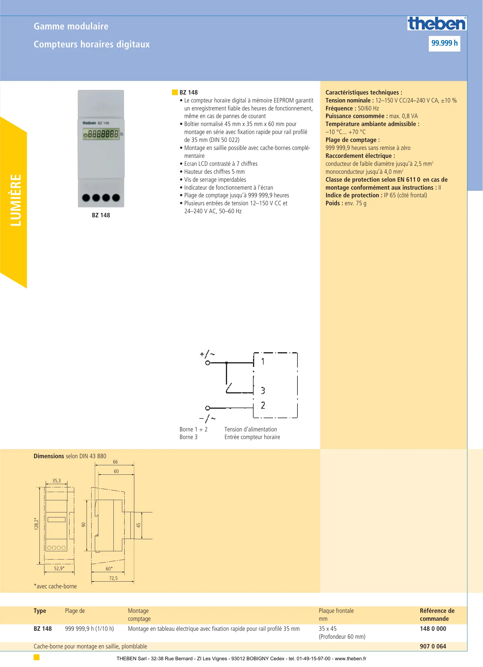 - Plusieurs entrées de tension 12–150 V CC et 24–240 V AC, 50–60 Hz BZ 148 Borne 1 + 2 Borne 3 Caractéristiques techniques : Tension nominale : 12–150 V CC/24–240 V CA, ±10 % Fréquence : 50/60 Hz Puissance consommée : max. 0,8 VA Température ambiante admissible : –10 °C... +70 °C Plage de comptage : 999 999,9 heures sans remise à zéro Raccordement électrique : conducteur de faible diamètre jusqu’à 2,5 mm2 monoconducteur jusqu’à 4,0 mm2 Classe de protection selon EN 611 0 en cas de montage conformément aux instructions : II Indice de protection : IP 65 (côté frontal) Poids : env. 75 g Tension d’alimentation Entrée compteur horaire Dimensions selon DIN 43 880