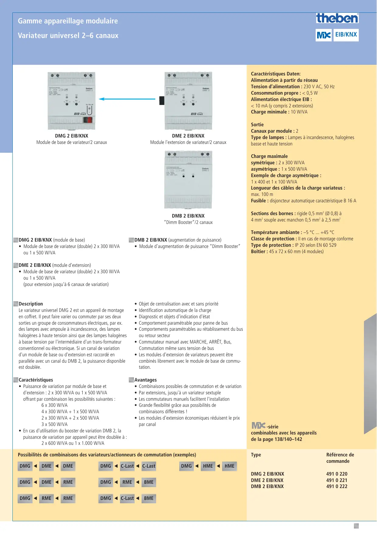 Module de base de variateur/2 canaux BIDMG 2 EIB/KNX (module de base) + Module de base de variateur (double) 2 x 300 W/VA ou 1 x 500 W/VA (BIDME 2 EIB/KNX (module d'extension) + Module de base de variateur (double) 2 x 300 W/VA ou 1 x 500 W/VA {pour extension jusqu'à 6 canaux de variation) MDescription Le variateur universel DMG 2 est un appareil de montage en coffret. Il peut faire varier ou commuter par ses deux sorties un groupe de consommateurs électriques, par ex. des lampes avec ampoule à incandescence, des lampes halogènes à haute tension ainsi que des lampes halogènes à basse tension par l'intermédiaire d'un trans-formateur conventionnel ou électronique. Si un canal de variation d'un module de base ou d'extension est raccordé en parallèle avec un canal du DMB 2, la puissance disponible est doublée. BMCaractéristiques « Puissance de variation par module de base et d'extension : 2 x 300 WIVA ou 1 x 500 WIVA offrant par combinaison les possibilités suivantes : 6 x 300 WIVA 4x 300 WIVA + 1 x 500 WIVA 2 x 300 WIVA + 2 x 500 WIVA 3x 500 WIVA + En cas d'utilisation du booster de variation DMB 2, la puissance de variation par appareil peut être doublée à : 2x 600 WIVA ou 1 x 1.000 WA L'U