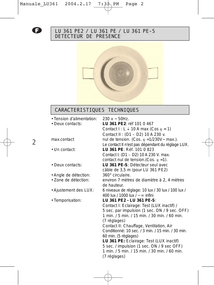 230 v ~ 50Hz. LU 361 PE2: réf 101 0 467 Contact I : L 10 A max (Cos j = 1) Contact II : (D1 – D2) 10 A 230 v. nul de tension. (Cos. j =1/230V~ max.). Le contact II n’est pas dépendant du réglage LUX. LU 361 PE: Réf. 101 0 823 Contact I: (D1 – D2) 10 A 230 V. max. contact nul de tension.(Cos. j =1). LU 361 PE-S: Détecteur seul avec câble de 3,5 m (pour LU 361 PE2) 360° circulaire. environ 7 mètres de diamètre à 2, 4 mètres de hauteur. 6 niveaux de réglage: 10 lux / 30 lux / 100 lux / 400 lux / 1000 lux / ~ ° infini LU 361 PE2 - LU 361 PE-S: Contact I: Eclairage: Test (LUX inactif) / 5 sec. par impulsion (1 sec. ON / 9 sec. OFF) 1 min. / 5 min. / 15 min. / 30 min. / 60 min. (7 réglages) Contact II: Chauffage, Ventilation, Air Conditionné: 10 sec. / 3 min. / 15 min. / 30 min. 60 min. (5 réglages) LU 361 PE: Eclairage: Test (LUX inactif) 5 sec. / impulsion (1 sec. ON / 9 sec OFF) 1 min. / 5 min. / 15 min. / 30 min. / 60 min. (7 réglages)