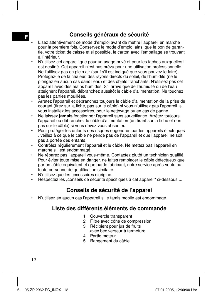 1. Posez l’appareil sur une surface ferme et plane. Installez-le de telle sorte qu’il ne puisse pas se renverser. 2. Placez le bol à jus (3) sur le bloc moteur (4) de façon à ce que le bec verseur (3) se trouve dans l’encoche prévue à cet effet et ferme correctement. Placez maintenant le filtre à pépins sur le bol à jus. 3. Branchez le câble d’alimentation dans une prise de courant en bon ètat de fonctionnement de 230 V, 50 Hz. 4. Mettez un verre (récipient) sous le bec du récipient de jus. Inclinez le bec verseur vers le bas pour ouvrir la fente du bec verseur. 5. Coupez en deux l’agrume par le milieu. Tenez d’une main le presse-agrumes fermement pendant que vous pressez la moitié de fruit sur le cône avec l’autre main. L’appareil commence de lui-même les mouvements de rotation. Vous obtiendrez un meilleur résultat en relâchant la pression, puis en appuyant de nouveau. Ce faisant, la direction de la rotation en est modifiée. ATTENTION: n’utilisez pas l’appareil pendant plus de 3 minutes! 6. Le jus coule dans le verre (récipient). La pulpe et les pépins restent dans le filtre. Fonction de centrifugeuse: Pour extraire encore du jus de la pulpe, l’appareil comporte une fonction de centrifugeuse. Mettez le couvercle (1) en place et appuyez sur celui-ci vers le bas. Le filtre tourne plus rapidement dans une direction. 7. Avant d’enlever le verre (récipient), appuyez sur le bec vers le haut pour fermer l’orifice d’écoulement du récipient de jus et éviter tout égouttement. 8. Débranchez l’appareil après utilisation et lavez l’appareil comme indiqué ciaprès. Dispositif d’enroulement du câble de secteur Vous pouvez enrouler le câble de secteur sur le sol. CONSEIL IMPORTANT Consommez les jus de citron rapidement. Ne conservez jamais les jus de citron dans un récipient en métal.
