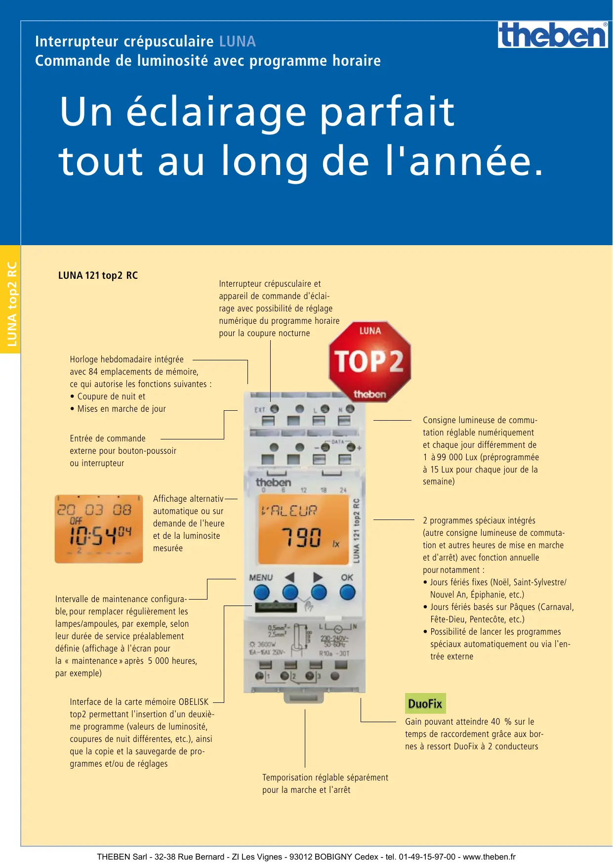 THEBEN Sarl - 32-38 Rue Bernard - ZI Les Vignes - 93012 BOBIGNY Cedex - tel. 01-49-15-97-00 - www.theben.fr LUNA top2 RC Vous conservez toute latitude pour prendre en compte les jours fériés mobiles : aucun problème avec cet interrupteur crépusculaire. Grâce à 2 programmes spéciaux intégrés à la fonction annuelle, non seulement les jours fériés fixes tels que Noël et le Jour de l'An, mais aussi les jours fériés basés sur Pâques, comme la Fête-Dieu ou la Pentecôte, sont automatiquement calculés pour l'année suivante. Vous vous offrez donc une pause en matière d'éclairage des locaux de votre entreprise, tout en réalisant des économies financières. Appareil de commande idéal pour un éclairage approprié des rues ainsi que des façades des bâtiments publics. Économique en termes de ressources énergétiques, la coupure de nuit s'effectue grâce à des programmes hebdomadaires et pour les vacances. DCF77 Grande puissance de commutation. La commutation au passage par zéro autorise un nombre de lampes important, tout en préservant le relais et la charge lumineuse. Montage pratique. Il est possible de raccorder jusqu'à 10 appareils numériques LUNA top2 à un capteur de luminosité numérique au moyen de 2 conducteurs seulement. Commande radio DCF77. Précision extrême grâce à la synchronisation horaire automatique basée sur l'émetteur de signaux horaires DCF77 situé à Mainflingen, près de Francfort (en option). Entrée de commande externe. Grâce à cette entrée de commande externe, il est tout à fait possible de raccorder un interrupteur ou plusieurs boutons-poussoirs par canal. Les fonctions suivantes sont alors disponibles au choix : MARCHE en permanence, ARRÊT en permanence, présélection de commutation, horloge de temps écoulé pour la MARCHE et l'ARRÊT, ainsi que fonction d'minuterie d'escalier. Logiciel PC. Clair et intuitif : grâce au logiciel PC supplémentaire OBELISK top2, créer des programmes de commutation sur son propre ordinateur est un jeu d'enfant. Il suffit de quelques minutes et de quelques clics pour créer des programmes, même complexes. La coupure de nuit et les phases d’enclenchement sont affichées très clairement sous forme de diagramme et consignées automatiquement dans un tableau. Les programmes peuvent alors être enregistrés, imprimés ou exportés au format Excel pour les différents clients. Pour en savoir plus sur le logiciel PC OBELISK, consulter les pages 18 à 19 et la page 23. THEBEN Sarl - 32-38 Rue Bernard - ZI Les Vignes - 93012 BOBIGNY Cedex - tel. 01-49-15-97-00 - www.theben.fr