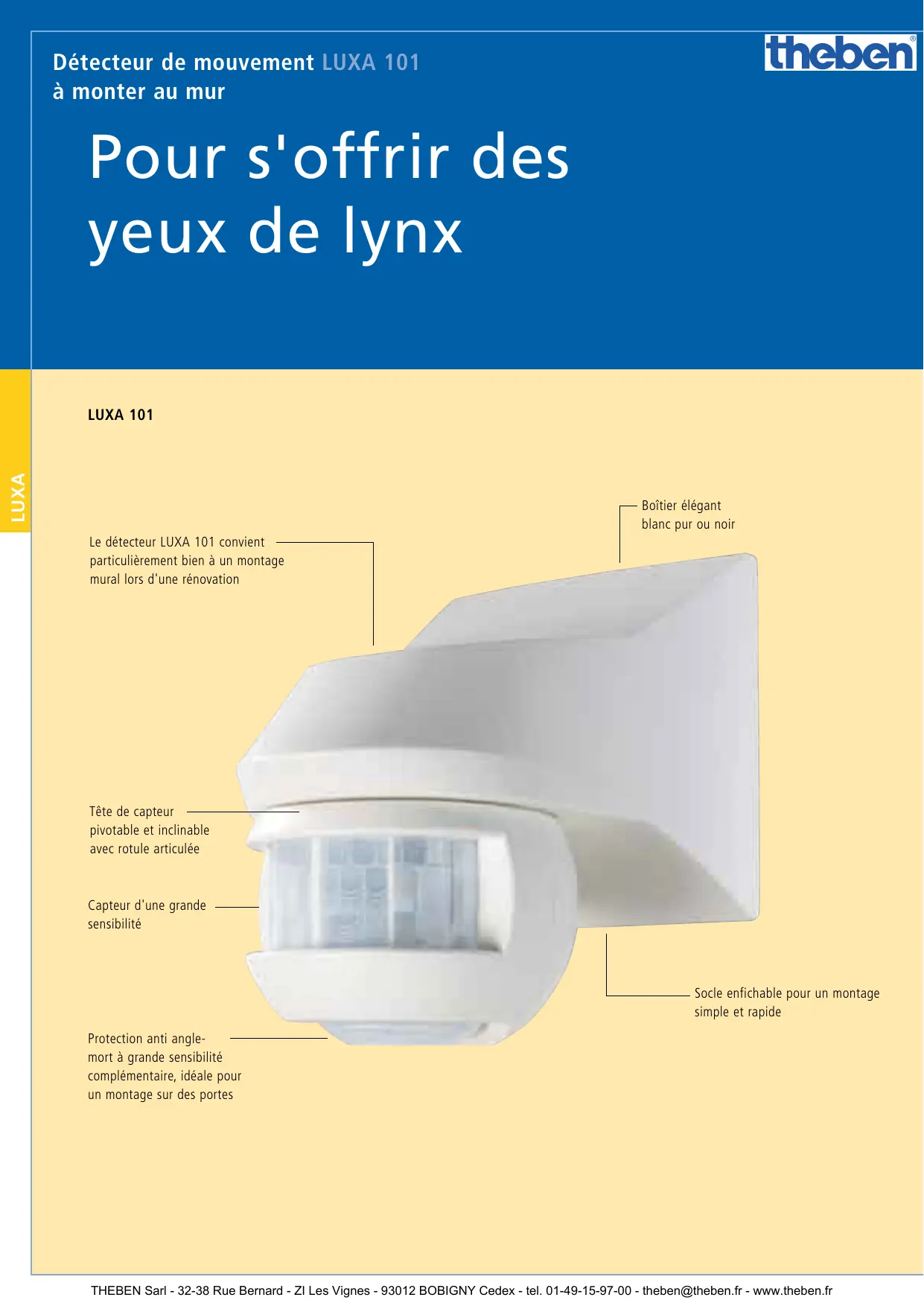 Détecteur de mouvement LUXA 101 theben à monter au mur Pour s'offrir des yeux de lynx LUXA THEBEN Sarl - 32-38 Rue Bernard - ZI Les Vignes - 93012 BOBIGNY Cedex - tel. 01-49-15-97-00 - theben@theben.fr - www.theben.fr
