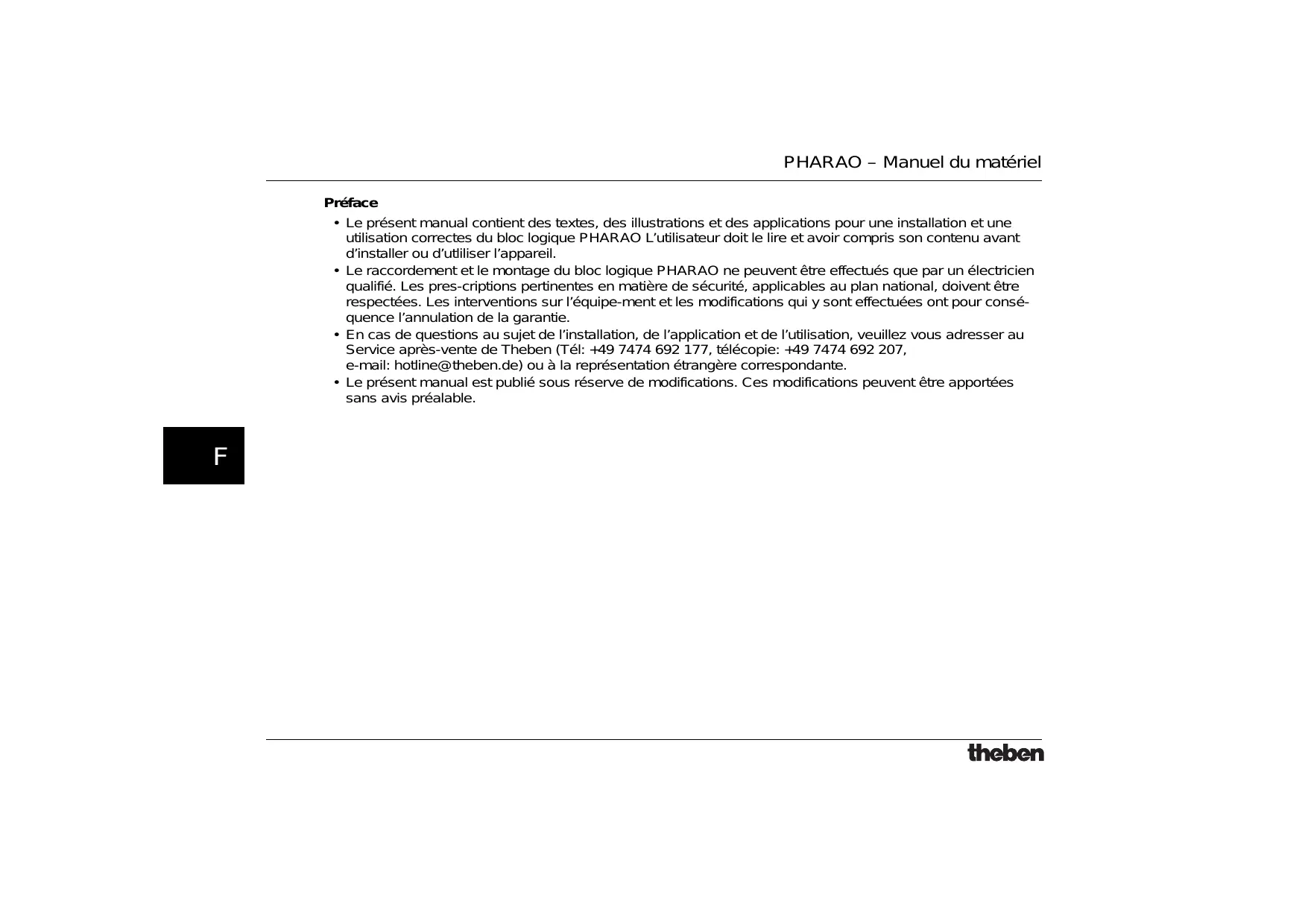 - En cas de questions au sujet de l’installation, de l’application et de l’utilisation, veuillez vous adresser au Service après-vente de Theben (Tél: +49 7474 692 177, télécopie: +49 7474 692 207, e-mail: hotline@theben.de) ou à la représentation étrangère correspondante.