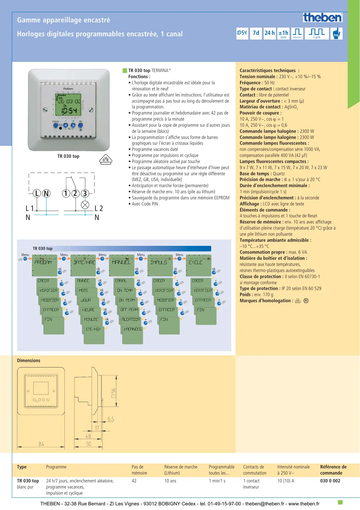 Cycle Caractéristiques techniques : Tension nominale : 230 V~, +10 %/–15 % Fréquence : 50 Hz Type de contact : contact inverseur Contact : libre de potentiel Largeur d’ouverture : < 3 mm (µ) Matériau de contact : AgSnO2 Pouvoir de coupure : 10 A, 250 V~, cos ϕ = 1 10 A, 250 V~, cos ϕ = 0,6 Commande lampe halogène : 2300 W Commande lampe halogène : 2300 W Commande lampes fluorescentes : non compensées/compensation série 1000 VA, compensation parallèle 400 VA (42 µF) Lampes fluorescentes compactes : 9 x 7 W, 7 x 11 W, 7 x 15 W, 7 x 20 W, 7 x 23 W Base de temps : Quartz Précision de marche : ≤ ± 1 s/jour à 20 °C Durée d’enclenchement minimale : 1 min (impulsion/cycle 1 s) Précision d’enclenchement : à la seconde Affichage : LCD avec ligne de texte Éléments de commande : 4 touches à impulsions et 1 touche de Reset Réserve de mémoire : env. 10 ans avec affichage d’utilisation pleine charge (température 20 °C) grâce à une pile lithium non polluante Température ambiante admissible : –10 °C...+35 °C Consommation propre : max. 6 VA Matière du boîtier et d’isolation : résistante aux haute températures, résines thermo-plastiques autoextinguibles Classe de protection : II selon EN 60730-1 si montage conforme Type de protection : IP 20 selon EN 60 529 Poids : env. 170 g Marques d’homologation : V F Dimensions Type Programme Pas de mémoire Réserve de marche (Lithium) Programmable toutes les... Contacts de commutation Intensité nominale à 250 V~ Référence de commande TR 030 top blanc pur 24 h/7 jours, enclenchement aléatoire, programme vacances, impulsion et cyclique