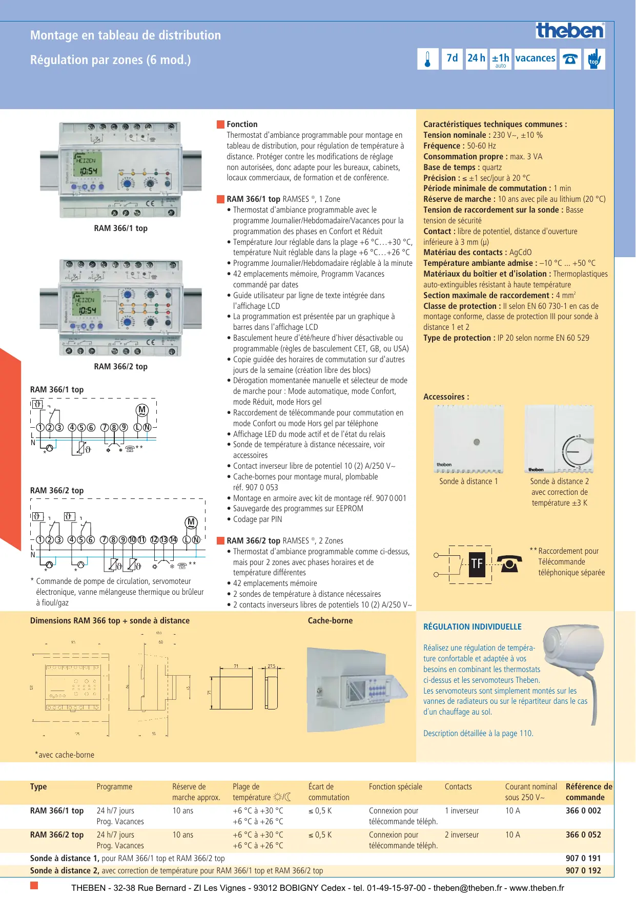 “*avec cache-borne Type Programme Réserve de Plage de Écart de Fonction spéciale marche approx. température Xÿ/C commutation RAM 366/1 top 24 h/7 jours 10 ans +6 °C à +30 °C <0,5K Connexion pour Prog. Vacances +6 °C à +26 °C télécommande tél RAM 366/2 top 24 h/7 jours 10 ans +6 °C à +30 °C <0,5K Connexion pour Prog. Vacances +6 °C à +26 °C télécommande tél Sonde à distance 1, pour RAM 366/1 top et RAM 366/2 top Sonde à distance 2, avec correction de température pour RAM 366/1 top et RAM 366/2 top theben La | 74 [nat fracnees) m | 9 Caractéristiques techniques communes : Tension nominale : 230 V-, 410 % Fréquence : 50-60 Hz Consommation propre : max. 3 VA Base de temps : quartz #1 secljour à 20 °C male de commutation : 1 min Réserve de marche : 10 ans avec pile au lithium (20 °C) Tension de raccordement sur la sonde : Basse tension de sécurité Contact : libre de potentiel, distance d'ouverture inférieure à 3 mm (p) Matériau des contacts : AgCdO Température ambiante admise : —10 °C … +50 °C Matériaux du boîtier et d'isolation : Thermoplastiques auto-extinguibles résistant à haute température Section maximale de raccordement : 4 mm° Classe de protection : | selon EN 60 730-1 en cas de montage conforme, casse de protection ll pour sonde à distance 1 et 2 Type de protection : IP 20 selon norme EN 60 529 ben SRE SSIPRARR Sonde à distance 1 Sonde à distance 2 avec correction de température 43 K ** Raccordement pour Télécommande téléphonique séparée