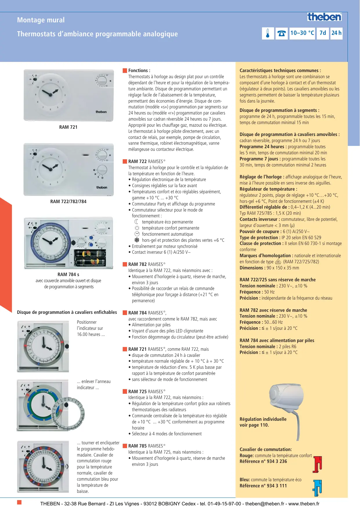 Le thermostat à horloge pilote directement, avec un contact de relais, par exemple, pompe de circulation, vanne thermique, robinet électromagnétique, vanne mélangeuse ou contacteur électrique. RAM 722 RAMSES ® Thermostat à horloge pour le contrôle et la régulation de la température en fonction de l´heure. • Régulation électronique de la température • Consignes réglables sur la face avant • Températures confort et éco réglables séparément, gamme +10 °C ... +30 °C • Commutateur Party et affichage du programme • Commutateur sélecteur pour le mode de fonctionnement : m température éco permanente r température confort permanente j fonctionnement automatique f hors-gel et protection des plantes vertes +6 °C • Entraînement par moteur synchronisé • Contact inverseur 6 (1) A/250 V~ RAM 782 RAMSES ® Identique à la RAM 722, mais néanmoins avec : • Mouvement d’horlogerie à quartz, réserve de marche, environ 3 jours • Possibilité de raccorder un relais de commande téléphonique pour forçage à distance (+21 °C en permanence) RAM 784 RAMSES ®, avec raccordement comme le RAM 782, mais avec • Alimentation par piles • Voyant d’usure des piles LED clignotante • Fonction dégommage du circulateur (peut-être activée) RAM 721 RAMSES ®, comme RAM 722, mais • disque de commutation 24 h à cavalier • température normale réglable de + 10 °C à + 30 °C • température de réduction d’env. 5 K plus basse par rapport à la température de confort paramétrée • sans sélecteur de mode de fonctionnement RAM 725 RAMSES ® Identique à la RAM 722, mais néanmoins : • Régulation de la température confort grâce aux robinets thermostatiques des radiateurs • Commande centralisée de la température éco réglable de +10 °C ... +30 °C conformément au programme horaire • Sélecteur à 4 modes de fonctionnement RAM 785 RAMSES ® Identique à la RAM 725, mais néanmoins : • Mouvement d’horlogerie à quartz, réserve de marche environ 3 jours