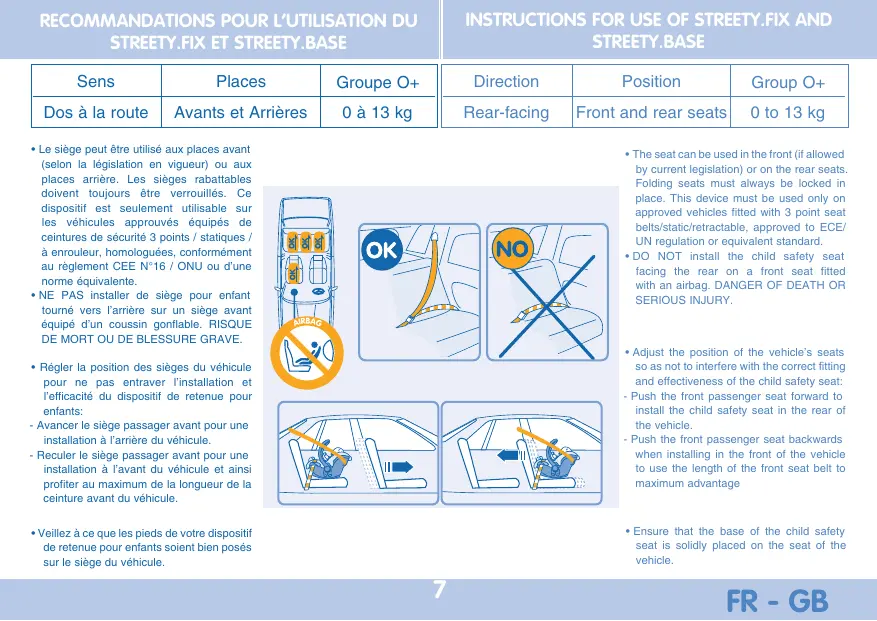 ATTENTION : Il est conseillé à l’usager de se mettre en rapport avec le distributeur ou le fabricant du système de retenue pour enfants, s’il a un doute sur l’installation correcte du système. WARNING: if in any doubt about the correct installation or use of the system, the user is advised to contact the distributor or the manufacturer of the child restraining device system.
