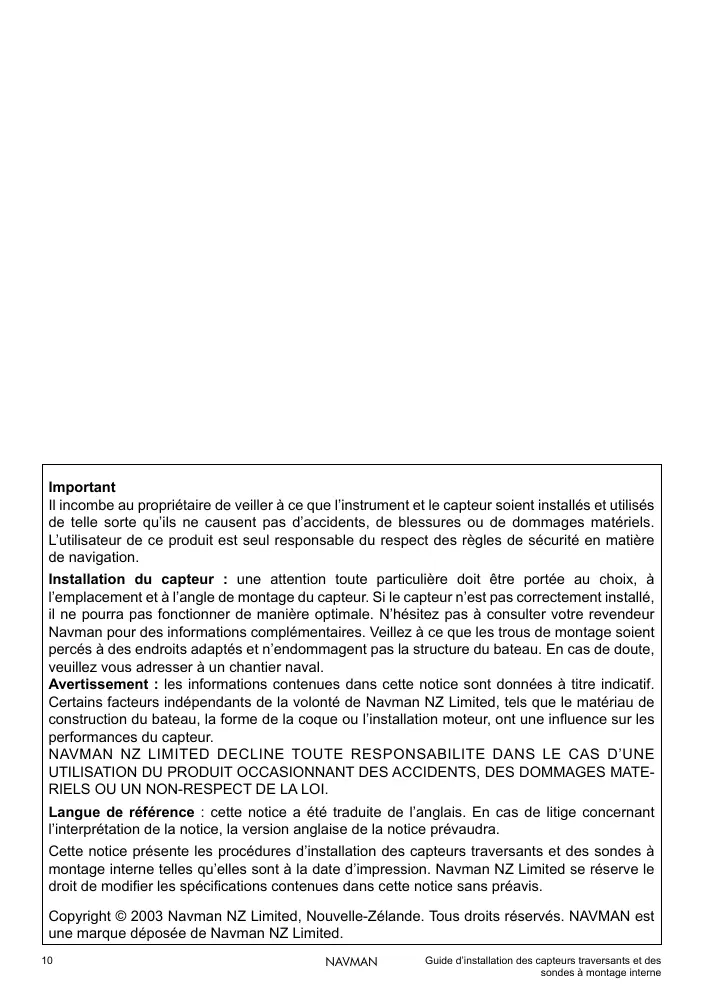 Important Il incombe au propriétaire de veiller à ce que l’instrument et le capteur soient installés et utilisés de telle sorte qu’ils ne causent pas d’accidents, de blessures ou de dommages matériels. L’utilisateur de ce produit est seul responsable du respect des règles de sécurité en matière de navigation. Installation du capteur : une attention toute particulière doit être portée au choix, à l’emplacement et à l’angle de montage du capteur. Si le capteur n’est pas correctement installé, il ne pourra pas fonctionner de manière optimale. N’hésitez pas à consulter votre revendeur Navman pour des informations complémentaires. Veillez à ce que les trous de montage soient percés à des endroits adaptés et n’endommagent pas la structure du bateau. En cas de doute, veuillez vous adresser à un chantier naval. Avertissement : les informations contenues dans cette notice sont données à titre indicatif. Certains facteurs indépendants de la volonté de Navman NZ Limited, tels que le matériau de construction du bateau, la forme de la coque ou l’installation moteur, ont une influence sur les performances du capteur. NAVMAN NZ LIMITED DECLINE TOUTE RESPONSABILITE DANS LE CAS D’UNE UTILISATION DU PRODUIT OCCASIONNANT DES ACCIDENTS, DES DOMMAGES MATERIELS OU UN NON-RESPECT DE LA LOI. Langue de référence : cette notice a été traduite de l’anglais. En cas de litige concernant l’interprétation de la notice, la version anglaise de la notice prévaudra. Cette notice présente les procédures d’installation des capteurs traversants et des sondes à montage interne telles qu’elles sont à la date d’impression. Navman NZ Limited se réserve le droit de modifier les spécifications contenues dans cette notice sans préavis. Copyright © 2003 Navman NZ Limited, Nouvelle-Zélande. Tous droits réservés. NAVMAN est une marque déposée de Navman NZ Limited. 10