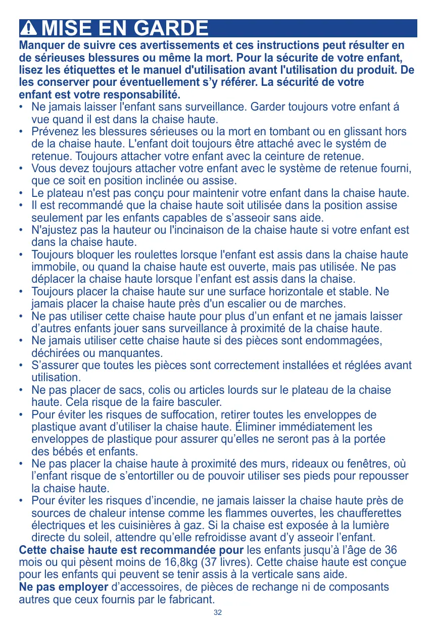 Manquer de suivre ces avertissements et ces instructions peut résulter en de sérieuses blessures ou même la mort. Pour la sécurite de votre enfant, lisez les étiquettes et le manuel d'utilisation avant l'utilisation du produit. De les conserver pour éventuellement s'y référer. La sécurité de votre enfant est votre responsabilité. + Ne jamais laisser l'enfant sans surveillance. Garder toujours votre enfant 4 vue quand il est dans la chaise haute. + _Prévenez les blessures sérieuses ou la mort en tombant ou en glissant hors de la chaise haute. L'enfant doit toujours être attaché avec le systém de retenue. Toujours attacher votre enfant avec la ceinture de retenue. +_ Vous devez toujours attacher votre enfant avec le système de retenue fourni, que ce soit en position inclinée ou assise. + Le plateau n'est pas conçu pour maintenir votre enfant dans la chaise haute. + _Il'est recommandé que la chaise haute soit utilisée dans la position assise seulement par les enfants capables de s'asseoir sans aide. + N'ajustez pas la hauteur ou l'incinaison de la chaise haute si votre enfant est dans la chaise haute. + Toujours bloquer les roulettes lorsque l'enfant est assis dans la chaise haute immobile, ou quand la chaise haute est ouverte, mais pas utilisée. Ne pas déplacer la chaise haute lorsque l'enfant est assis dans la chaise. +_ Toujours placer la chaise haute sur une surface horizontale et stable. Ne jamais placer la chaise haute près d'un escalier ou de marches. + _Ne pas utiliser cette chaise haute pour plus d'un enfant et ne jamais laisser d’autres enfants jouer sans surveillance à proximité de la chaise haute. + Ne jamais utiliser cette chaise haute si des pièces sont endommagées, déchirées ou manquantes. +_ S'assurer que toutes les pièces sont correctement installées et réglées avant utilisation. + Ne pas placer de sacs, colis ou articles lourds sur le plateau de la chaise haute. Cela risque de la faire basculer. +_ Pour éviter les risques de suffocation, retirer toutes les enveloppes de plastique avant d'utiliser la chaise haute. Éliminer immédiatement les enveloppes de plastique pour assurer qu'elles ne seront pas à la portée des bébés et enfants. + _ Ne pas placer la chaise haute à proximité des murs, rideaux ou fenêtres, où l'enfant risque de s’entortiller ou de pouvoir utiliser ses pieds pour repousser la chaise haute. + Pour éviter les risques d'incendie, ne jamais laisser la chaise haute près de sources de chaleur intense comme les flammes ouvertes, les chaufferettes électriques et les cuisinières à gaz. Si la chaise est exposée à la lumière directe du soleil, attendre qu'elle refroidisse avant d'y asseoir l'enfant. Cette chaise haute est recommandée pour les enfants jusqu'à l’âge de 36 mois ou qui pèsent moins de 16,8kg (37 livres). Cette chaise haute est conçue pour les enfants qui peuvent se tenir assis à la verticale sans aide. Ne pas employer d'accessoires, de pièces de rechange ni de composants autres que ceux fournis par le fabricant.