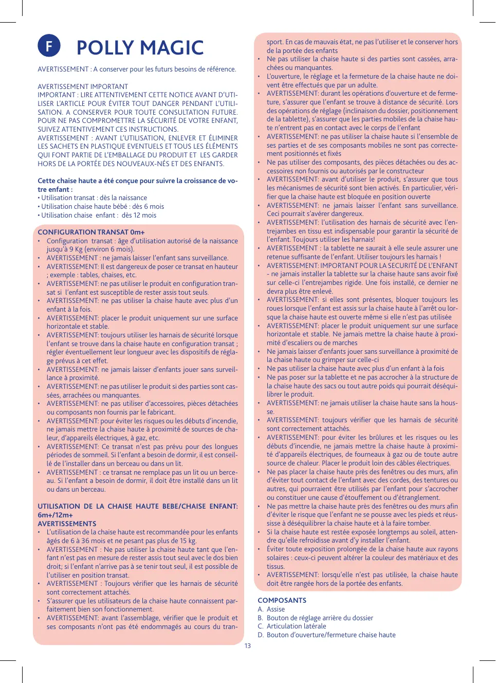 UTILISATION DE LA CHAISE HAUTE BEBE/CHAISE ENFANT: 6m+/12m+ AVERTISSEMENTS