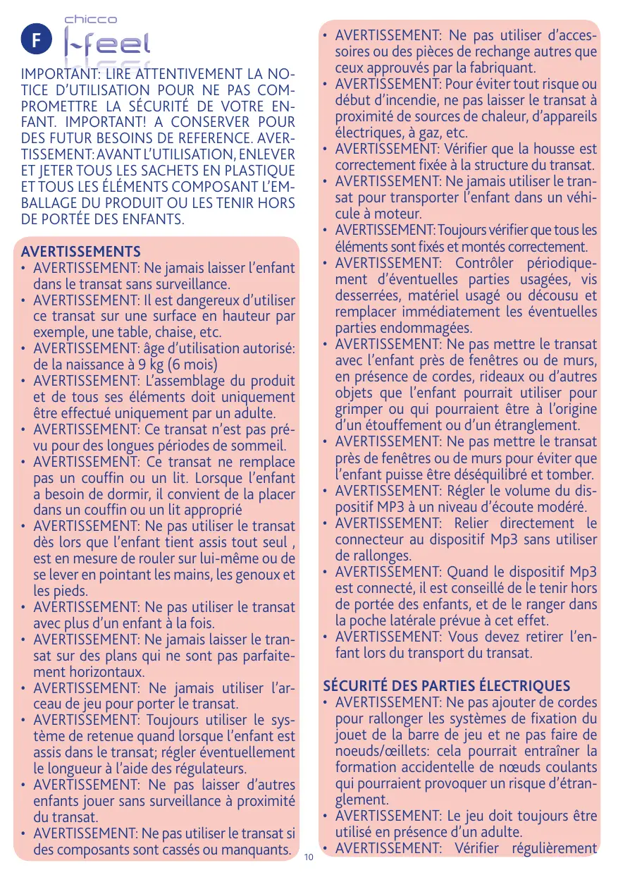 TRANSAT I-FEEL ROSE - Transat pour bébé CHICCO - Notice d'utilisation et mode d'emploi gratuit