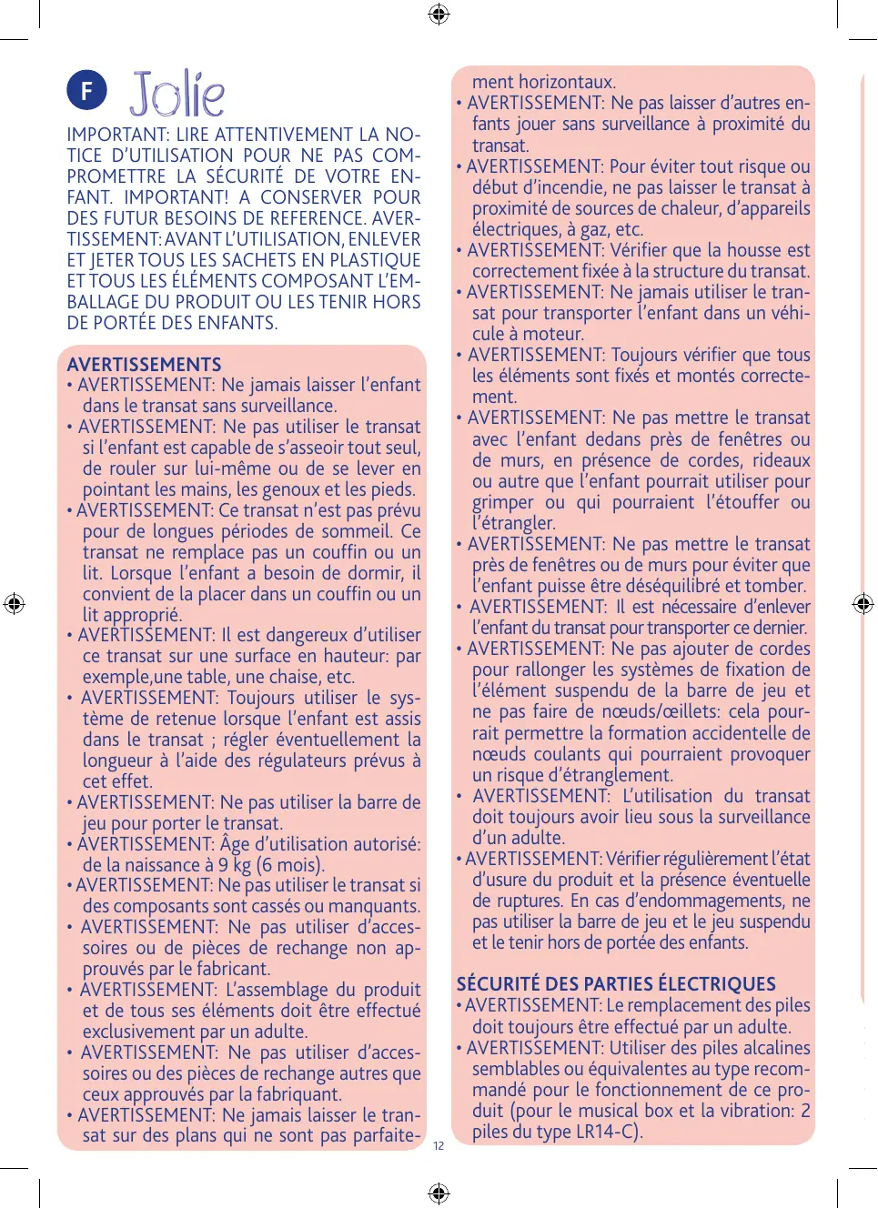 - AVERTISSEMENT: Ce transat n’est pas prévu pour de longues périodes de sommeil. Ce transat ne remplace pas un couffin ou un lit. Lorsque l’enfant a besoin de dormir, il convient de la placer dans un couffin ou un lit approprié.