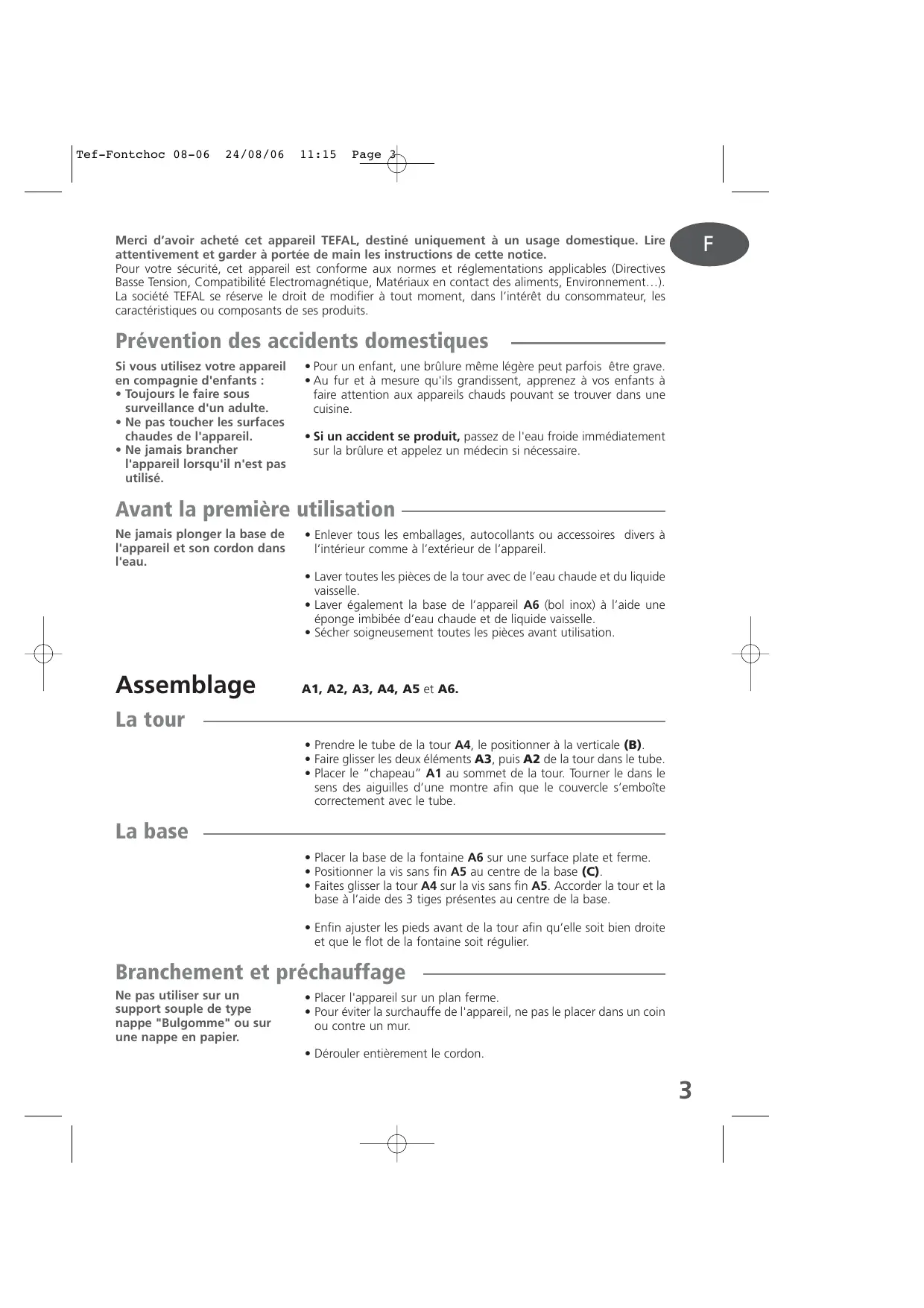 Tef-Fontchoc 08-06 24/08/06 11:15 Page 3 Merci d’avoir acheté cet appareil TEFAL, destiné uniquement à un usage domestique. Lire attentivement et garder à portée de main les instructions de cette notice. Pour votre sécurité, cet appareil est conforme aux normes et réglementations applicables (Directives Basse Tension, Compatibilité Electromagnétique, Matériaux en contact des aliments, Environnement…). La société TEFAL se réserve le droit de modifier à tout moment, dans l’intérêt du consommateur, les caractéristiques ou composants de ses produits.