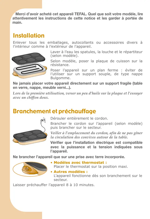 Ne jamais placer votre appareil directement sur un support fragile (table en verre, nappe, meuble verni...). Lors de la première utilisation, verser un peu d’huile sur la plaque et l’essuyer avec un chiffon doux.