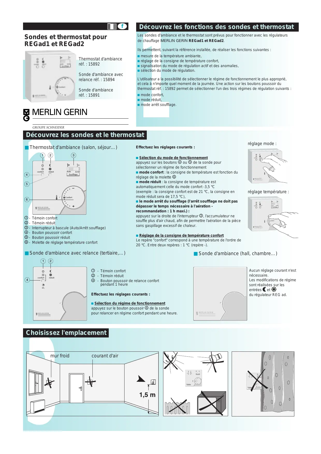 Les sondes d'ambiance et le thermostat sont prévus pour fonctionner avec les régulateurs de chauffage MERLIN GERIN REGad1 et REGad2. Ils permettent, suivant la référence installée, de réaliser les fonctions suivantes : Thermostat d'ambiance réf. : 15892 Sonde d'ambiance avec relance réf. : 15894 Sonde d'ambiance réf. : 15891 MERLIN GERIN GROUPE SCHNEIDER c mesure de la température ambiante, c réglage de la consigne de température confort, c signalisation du mode de régulation actif et des anomalies, c sélection du mode de régulation. L'utilisateur a la possibilité de sélectionner le régime de fonctionnement le plus approprié, et cela à n'importe quel moment de la journée. Une action sur les boutons poussoir du thermostat réf. : 15892 permet de sélectionner l'un des trois régimes de régulation suivants : c mode confort, c mode réduit, c mode arrêt soufflage. Découvrez les sondes et le thermostat réduit Auto Arrêt Soufflage Confort MERLIN GERIN 123456- Témoin confort Témoin réduit Interrupteur à bascule (Auto/Arrêt soufflage) Bouton poussoir confort Bouton poussoir réduit Molette de réglage température confort c Sélection du mode de fonctionnement appuyez sur les boutons 4 ou 5 de la sonde pour sélectionner un régime de fonctionnement c mode confort : la consigne de température est fonction du réglage de la molette 6 c mode réduit : la consigne de température est automatiquement celle du mode confort -3,5 °C (exemple : la consigne confort est de 21 °C, la consigne en mode réduit sera de 17,5 °C), c le mode arrêt du soufflage (l'arrêt soufflage ne doit pas dépasser le temps nécessaire à l'aération recommandation : 1 h maxi.) : appuyez sur la droite de l'interrupteur 3, l'accumulateur ne souffle plus d'air chaud, afin de permettre l'aération de la pièce sans gaspillage excessif de chaleur. confort réduit 20°C MERLIN GERIN réglage température : confort réduit Confort MERLIN GERIN Aucun réglage courant n'est nécessaire. Les modifications de régime sont réalisées sur les entrées et du régulateur REG ad. - Témoin confort - Témoin réduit - Bouton poussoir de relance confort pendant 1 heure Effectuez les réglages courants : c Sélection du régime de fonctionnement appuyez sur le bouton poussoir 4 de la sonde pour relancer en régime confort pendant une heure. MERLIN GERIN Choisissez l'emplacement